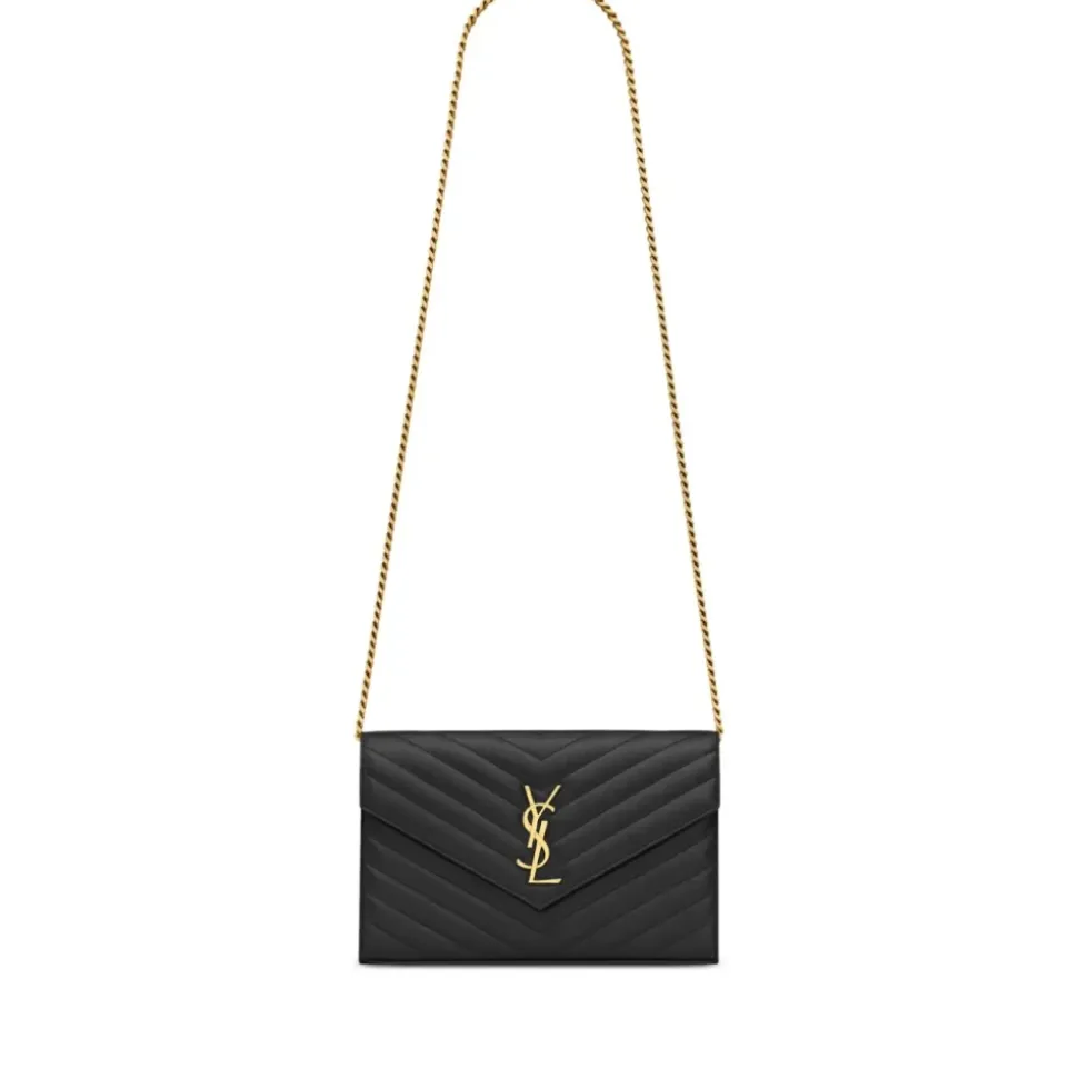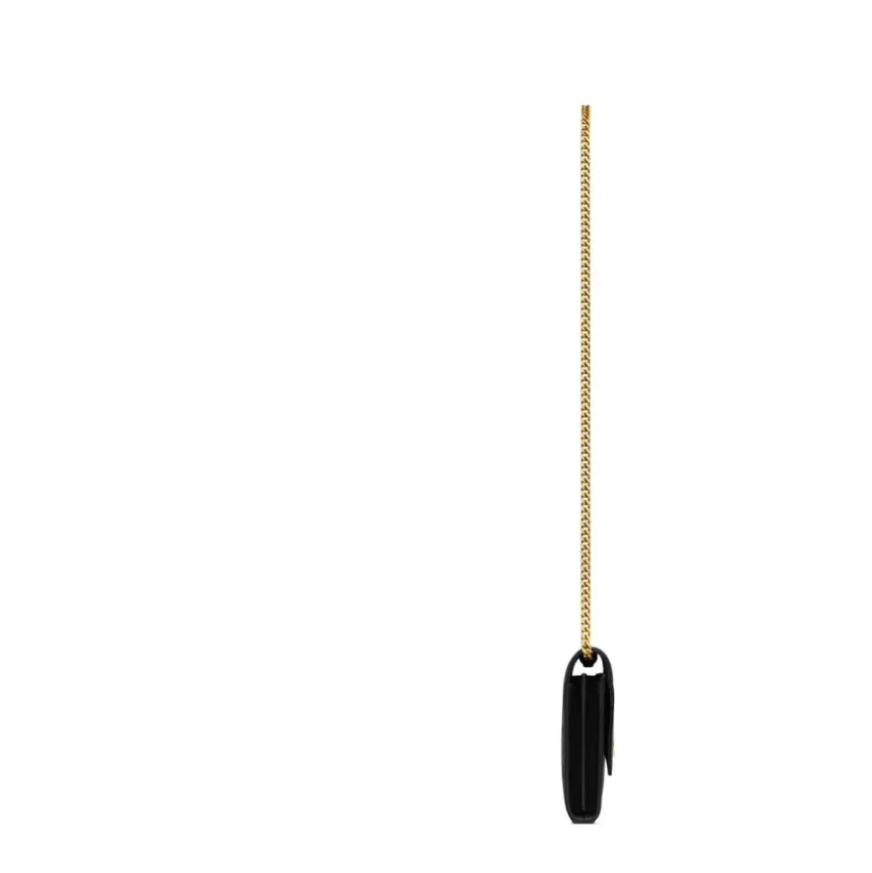 Saint Laurent Cassandre Chain Wallet er en kompakt wallet-on-chain i lammeskind med chevron matelassé quiltning og en aftagelig kæde, designet til at rumme kort og essentielle ting til håndfri brug. Nøgleattributter: Sort | Lammeskind | Magnetisk tryklåslukning | Ti kortlommer | To centrale rum | Indvendig lynlåslomme | Aftagelig kæderem | Chevron (matelassé) quiltning | Klap med tryklåslukning | Sammenflettet YSL logo | Guldfarvet hardware | Kompakt wallet-on-chain silhuet | Mål & pasform: Højde 14 cm | Bredde 22,5 cm | Dybde 4 cm | Rem 48 cm | Sammensætning & pleje: 100% lammeskind