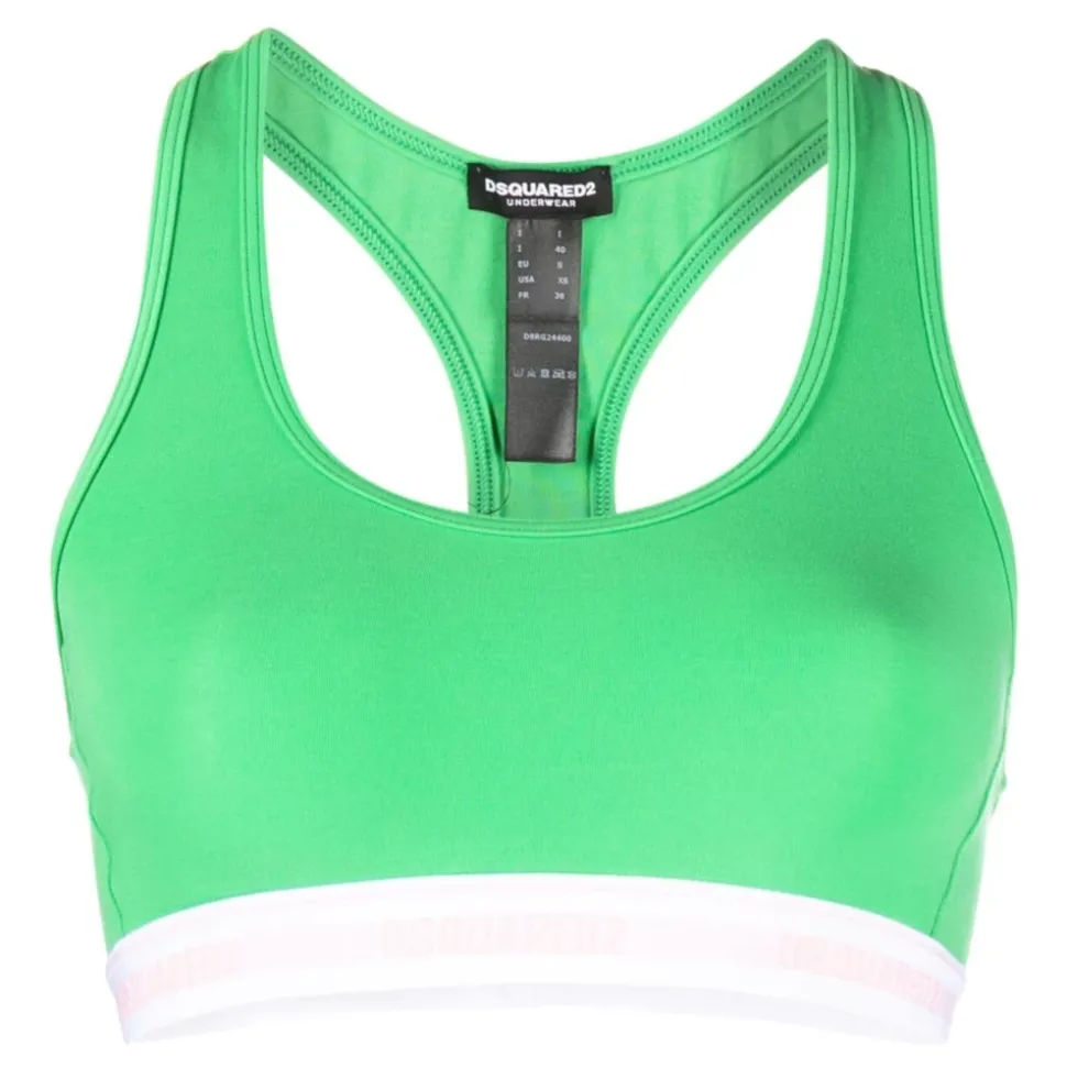 Vær komfortabel og stilfuld under dine træninger med denne grønne sports-BH fra Dsquared2, designet til din fitnessrutine. Produkt detaljer: Grøn | 80% Bomuld | 20% Elastan | Åndbart stof | Støttende pasform | Scoop-udskæring | Dimensioner og pasform: Normal pasform | Sammensætning og pleje: 80% Bomuld | 20% Elastan | Maskinvask kold, tørretumbles ved lav varme