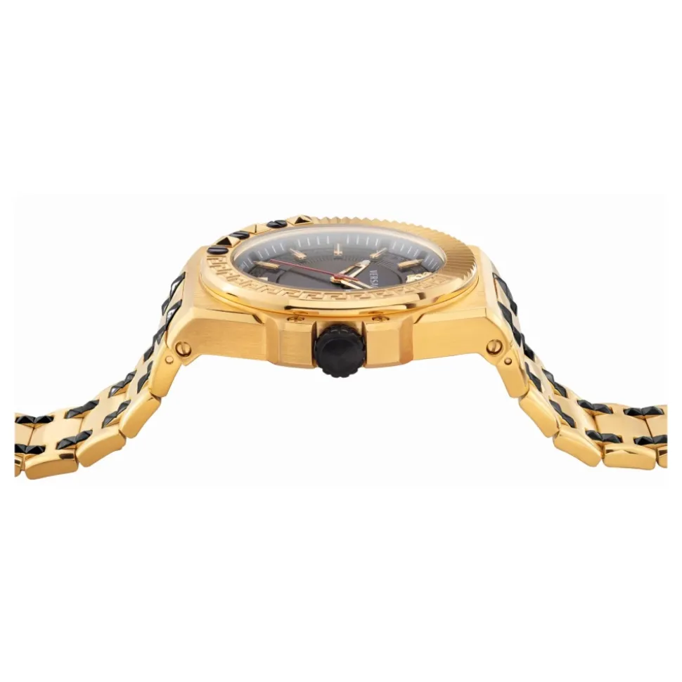 Opdag Versace Chain Reaction Watch 45 MM, et alsidigt ur, der udstråler ubesværet elegance. Dette ur, der passer til enhver lejlighed, har en rustfri stålkasse, en iøjnefaldende sort urskive og intrikate detaljer på den øverste ring. Armbåndet med kædemønster tilføjer et strejf af sofistikation. Udover et tidløst design har dette ur også vandtæt teknologi, der tillader det at modstå vanddybder på op til 50 meter. De schweiziske kvarts-mekanismer er beskyttet af det rustbestandige og forgyldte urkasse, der sikrer holdbarhed. Et ægte blikfang fra Chain Reaction-kollektionen. Mærke: Versace Model: VEDY006 19 Produkttype: Armbåndsur Afdeling: Mænd Display: Analog Funktioner: Time, Minut, Sekund, Dato Urværk: Kvarts Glas: Mineralglas Skivefarve: Sølv Kasseform: Rund Kassebredde: 45mm Kassetype: Rustfrit stål Kassefarve: Guld Båndmateriale: Rustfrit stål Båndfarve: Guld Båndbredde: 21mm Lukketype: Foldelås Vandtæthed: 5 Bar Produceret i Schweiz.