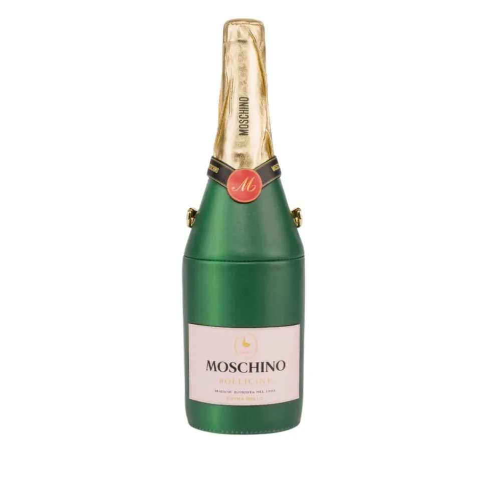 Moschino Champagne Bottle Bag er en flaskeformet mini taske, der skiller sig ud med sit glas-effekt print og guldlaminerede topdetalje. Den kombinerer en ny silhuet med praktiske funktioner som en aftagelig skulderrem i metal og en lynlåslukning bagpå. Vigtigste egenskaber: Flaskegrøn | Kalveskind | Foret indvendigt | Aftagelig skulderrem i metal | Lynlåslukning bagpå | Flaskeformet silhuet | Glas-effekt print | Polstret top, der simulerer kork | Guldlamineret topdetalje | Printede labeldetaljer | Guldelektropletteret hardware | Dimensioner & pasform: Dybde: 9 cm | Bredde: 33 cm | Højde: 9 cm | One size | Sammensætning & pleje: Overdel: 80% Kalveskind, 20% Fåreskind | Foring: 100% Bomuld