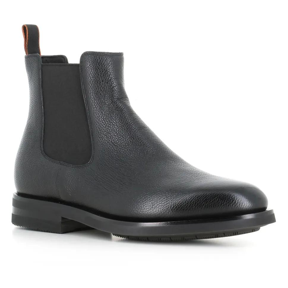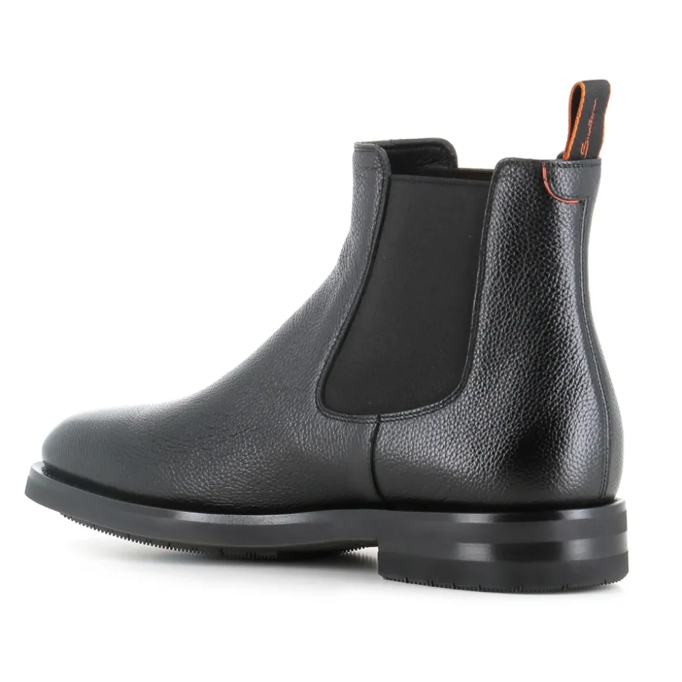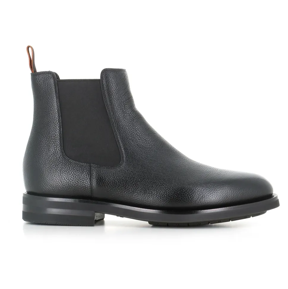 Santoni Chelsea Easy Boot – en raffineret Chelsea-støvle i læder, der kombinerer slip-on-bekvemmelighed med en slidstærk gummisål, ideel til smart-casual og bybrug. Vigtigste egenskaber: Sort | Læder | Gummisål | Kan omsåles | Goodyear welt-konstruktion | Elastiske sideindsatser for nem på- og aftagning | Foret indre | Slip-on design | Mandelformet tå | Ankelhøj Chelsea-silhuet | Trækfane bagpå | Dimensioner og pasform: Hæl: 3 cm | Passer normalt i størrelsen | Sammensætning og pleje: Overdel: Læder | Foring: Læder | Sål: Gummi