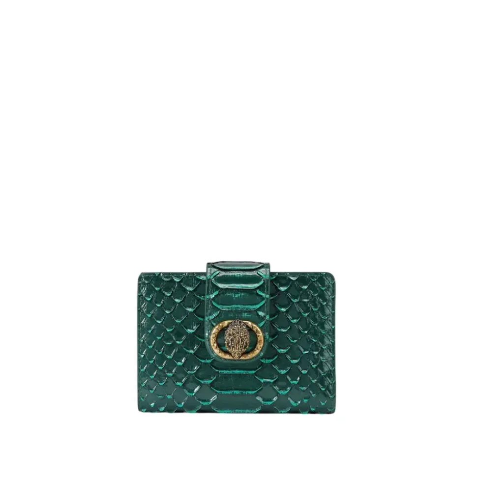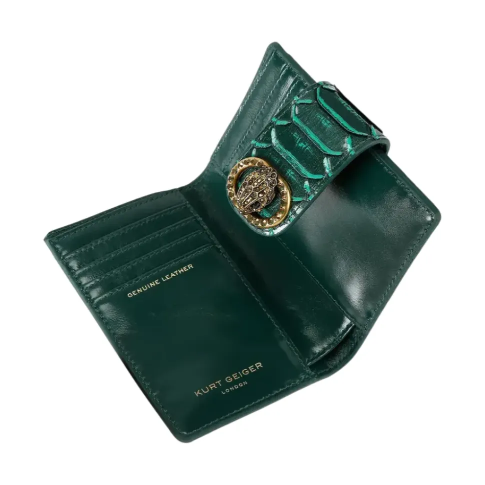 Kurt Geiger Chelsea Fold Wallet i krokodillepræget læder med en antik messingfarvet ørnehoved-detalje med krystal ved klappen – en kompakt fold-pung til daglig brug af kort og kontanter. Nøglefunktioner: Grøn | Læder | Fold-over klaplukning | Flere kortlommer | Indvendig kontantlomme | Klar ID-lomme | Krokodillepræget tekstur | Antik messingfarvet ørnehoved med krystaludsmykning | Klaplukning | Mål og pasform: 9 cm (H) x 12 cm (B) x 2 cm (D) | Kompakt størrelse | Sammensætning og pleje: Læder