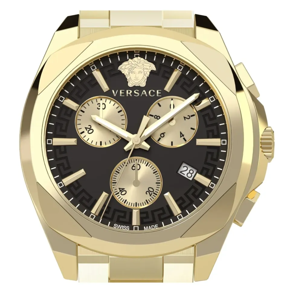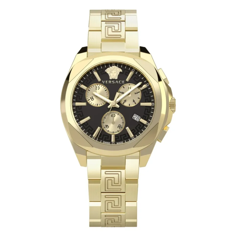 Versace Chrono Lady 40mm kombinerer et guldfarvet urkasse og armbånd i rustfrit stål med en sort urskive og kronograffunktioner. Det tilbyder præcis quartz-tidtagning og et datovindue til raffineret hverdagsbrug. Nøgleattributter: Gul | Guld | Rustfrit stål | Vandafvisende til 5 bar | Safirkrystal | Kronograf med tre subdials | Datovindue | Quartz-urværk | Sort urskive | Guldfarvet urkasse og armbånd | Kronograf layout | Dimensioner & pasform: Urkassediameter: 40 mm | Sammensætning & pleje: Rustfrit stål | Quartz-urværk | Safirkrystal