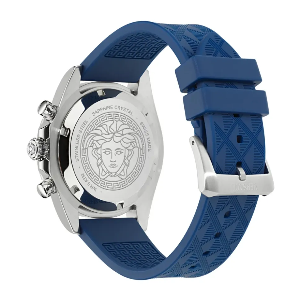 Versace Chrono X er et præcisions chronograph ur fra Versace, der kombinerer en urkasse i rustfrit stål med en markant blå urskive for et raffineret hverdags- og formelt look. Vigtigste egenskaber: Sølv | Blå | Rustfrit stål (IP sølv) | Chronograph funktion | Blå urskive | Sølvfarvet urkasse finish | Chronograph layout | Dimensioner & pasform: Urkasse diameter: 44 mm | Sammensætning & pleje: Rustfrit stål (IP sølv) | PU rem