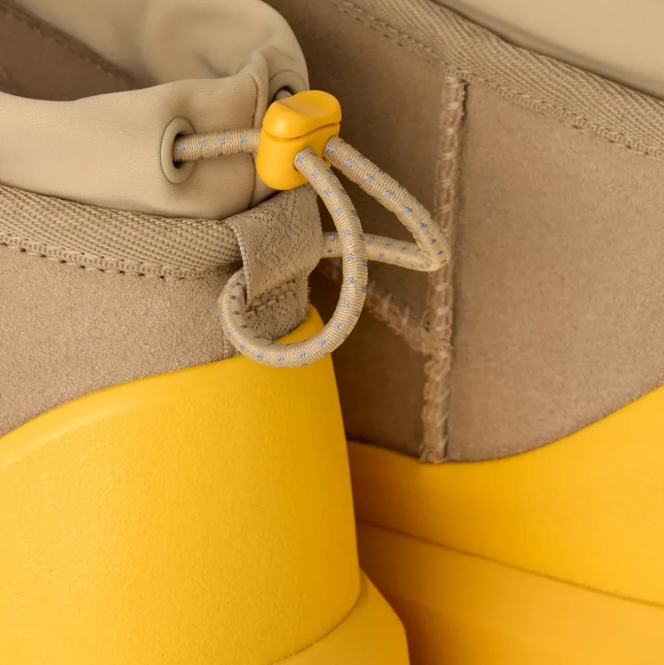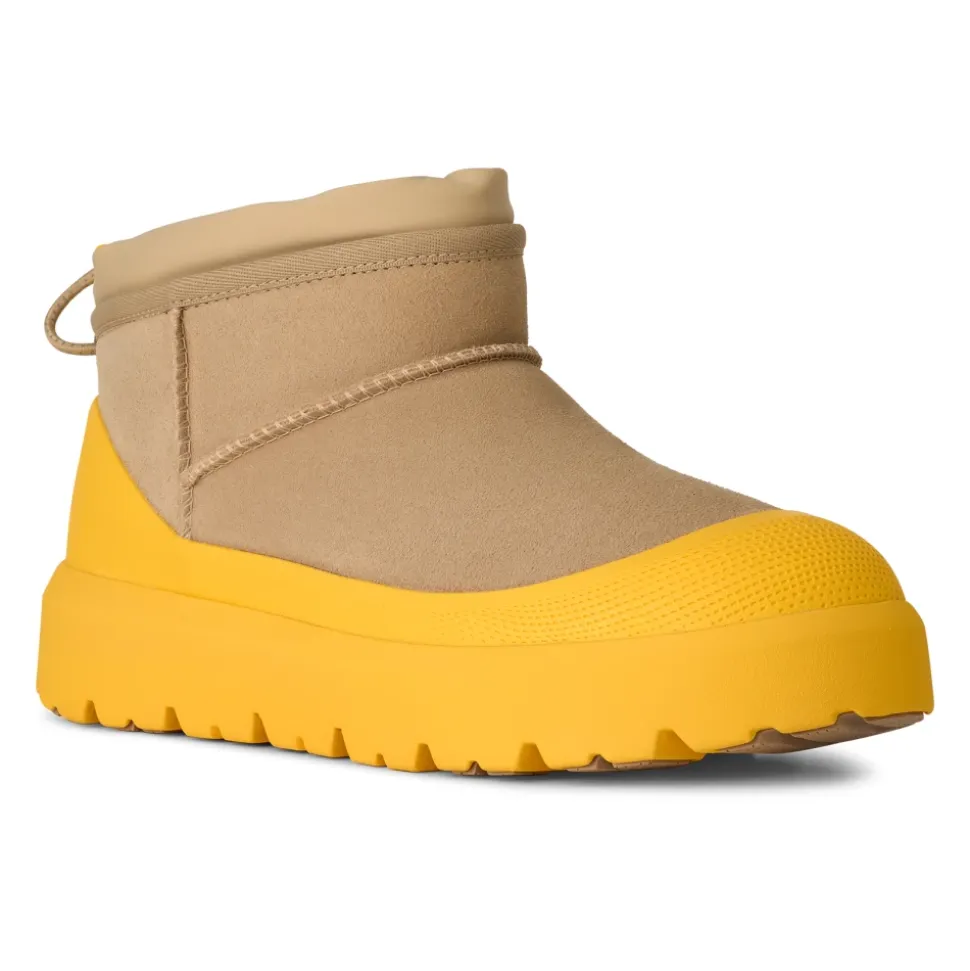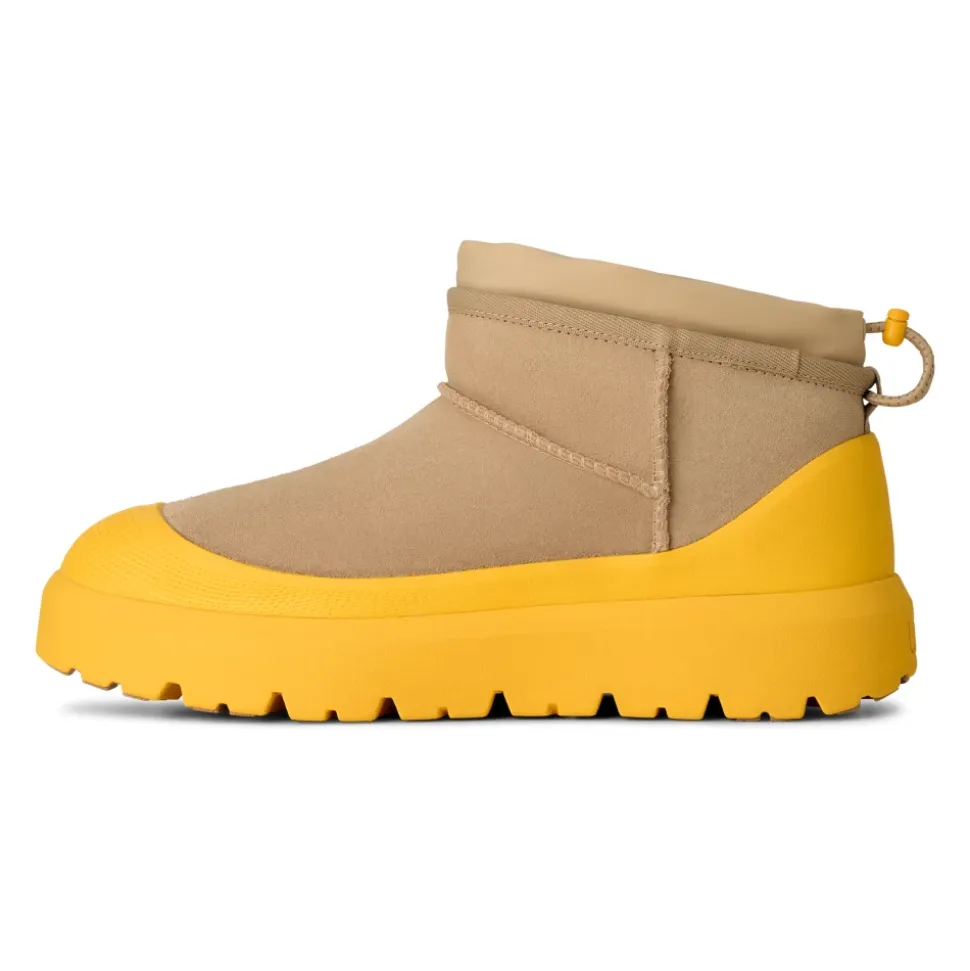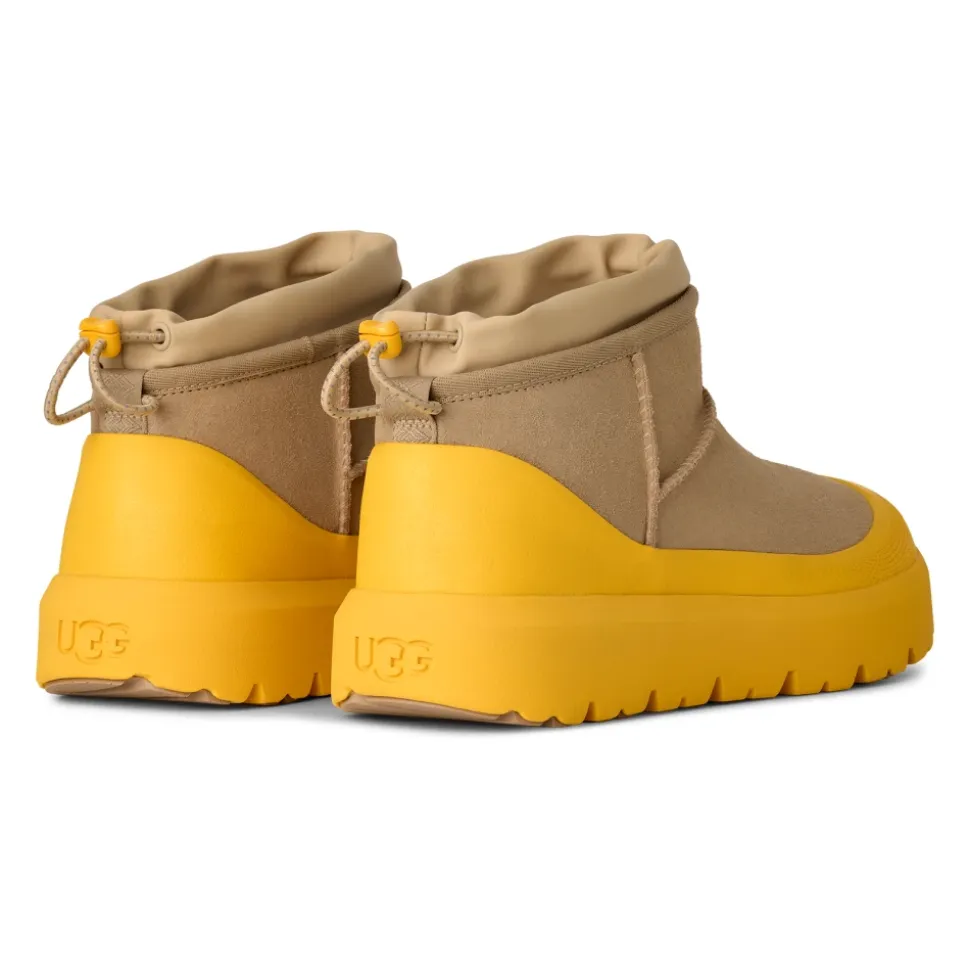 UGG Classic Ultra Mini Weather Hybrid er en kortskaftet vinterstøvle, der kombinerer vandtæt ruskind med en justerbar lukning for ekstra beskyttelse i våde og kolde forhold. Den er designet til nem på- og aftagning samt forbedret trækkraft på glatte overflader. Vigtigste egenskaber: Multicolor | Mustard seed | Summer wheat | Ruskind | Vandtæt ruskind | Sømforseglet konstruktion | Spider Rubber-trækknopper | Sugarcane EVA-ydersål | Vinterklassificeret til -20°C | Justerbar lukning med elastisk snøre for justerbar pasform | UGGplush-foring og -indersål for komfort | Permanent skumgaloch | Ultra mini kort skaft | Justerbar lukning med elastisk snøre | UGG-logo på hæl | Sammensætning og pleje: Overdel: Vandtæt ruskind | Snørebånd: 45% polyester, 55% latex | Foring: 17 mm UGGplush (60% uld, 40% TENCEL Lyocell; bagside: polyester) | Indersål: 17 mm UGGplush (60% uld, 40% TENCEL Lyocell) | Ydersål: Sugarcane EVA med Spider Rubber-knopper | Fodseng: Støbt PU-fodseng