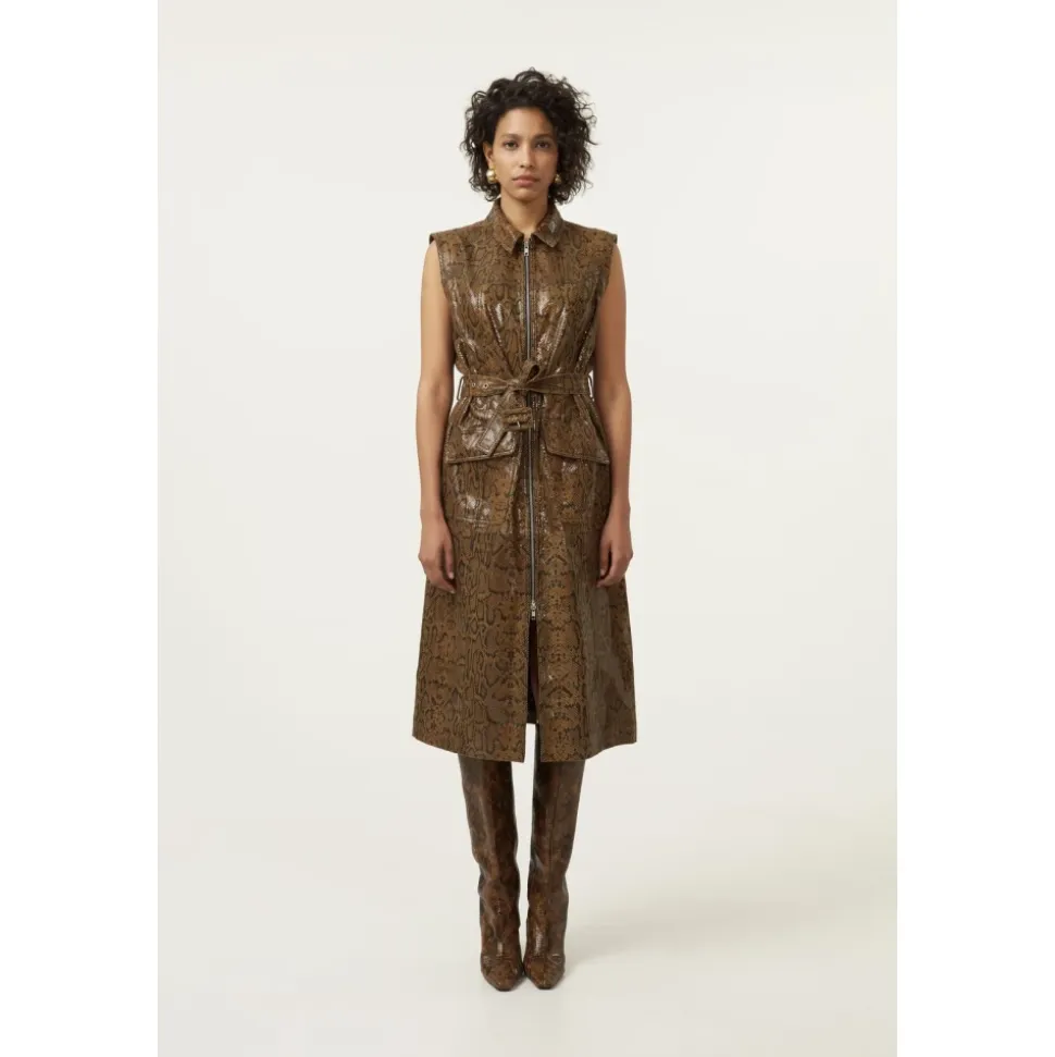 Gestuz Colette Læderkjole er en to-i-én model i lammeskind med lynlåsærmer, der kan laves om fra en frakke til under knæet til en ærmeløs kjole, ideel til efterårsbegivenheder og streetwear-styling. Vigtige egenskaber: Flerfarvet | Gummi | Lammeskind | Aftagelige lynlåsærmer | Konvertibelt frakke-til-kjole design | Lynlåsærmer | Bælte detalje | Mål og pasform: Længde: Under knæet | Længde: 115 cm svarer til størrelse 36 | Løs pasform | Sammensætning og pleje: 100% lammeskind | Foring: 97% polyester, 3% elastan