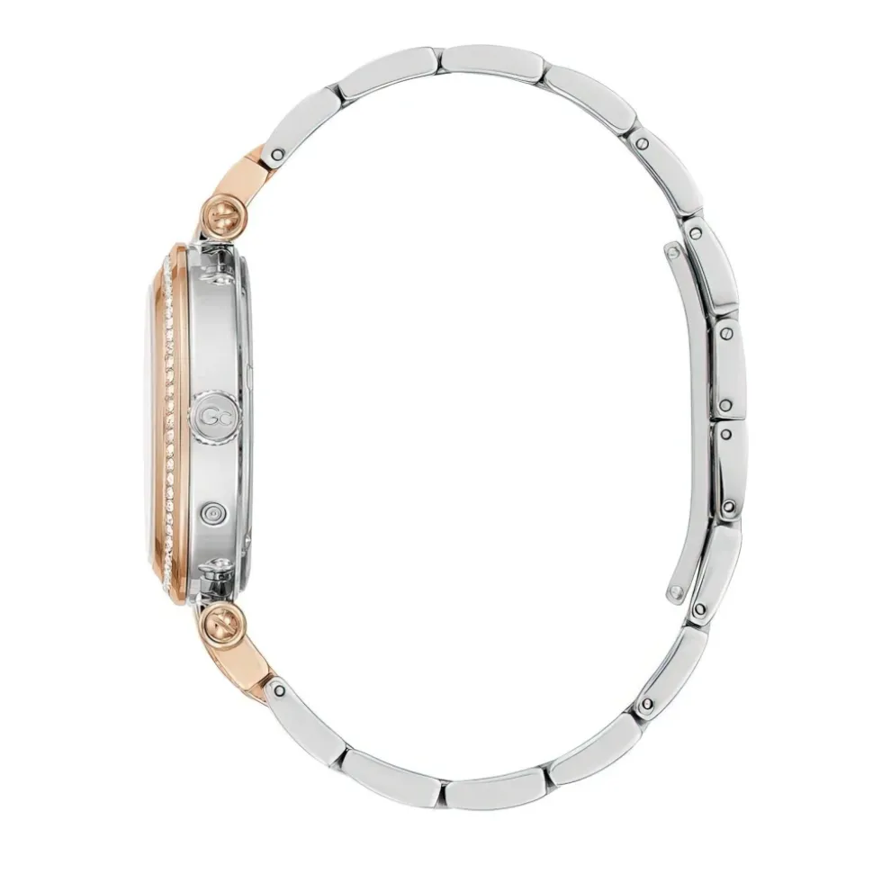 Forhøj din stil med dette elegante Guess-ur til kvinder. Med en 36,5 mm rustfrit stålkasse, hvid perlemors urskive, schweizisk kvartsbevægelse og safirbelagt mineralglas. Det sølvfarvede rustfri stålarmbånd med sommerfuglelukning fuldender designet. Vandtæt op til 10 ATM, med Swarovski-krystaller på lunetten og indekserne samt Super-LumiNova-luminøse visere.