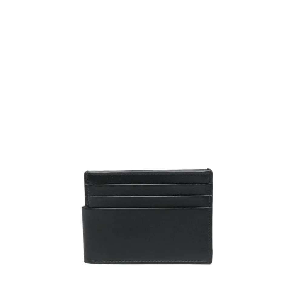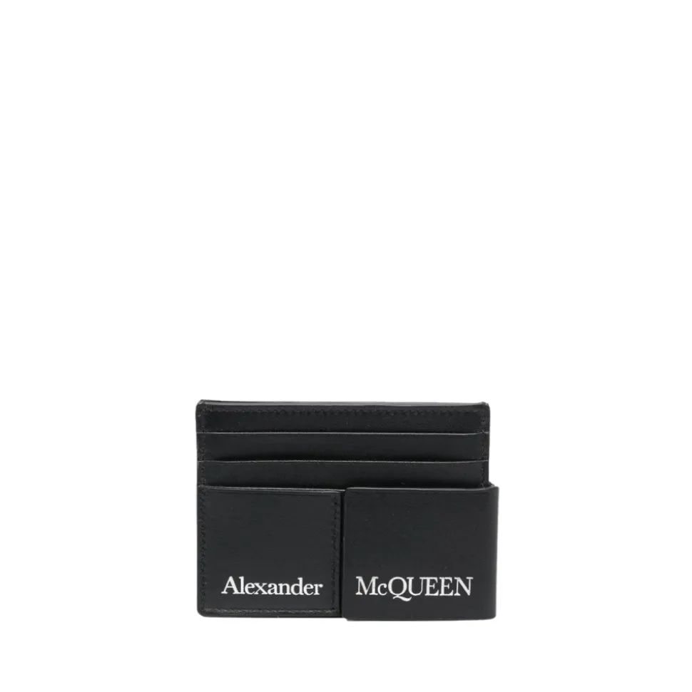 Opgrader dit tilbehør med denne Alexander McQueen Delbar Dobbelt Kortholder. Fremstillet af sort læder, præsenterer denne kortholder en kontrasterende præget logo på forsiden for et strejf af raffinement. Med seks kortlommer, to pengeseddelrum og en praktisk trykknap-lukning er denne kompakte pung både praktisk og stilfuld. Dens dimensioner på 11x9x1 cm gør den perfekt til enhver lomme eller taske.