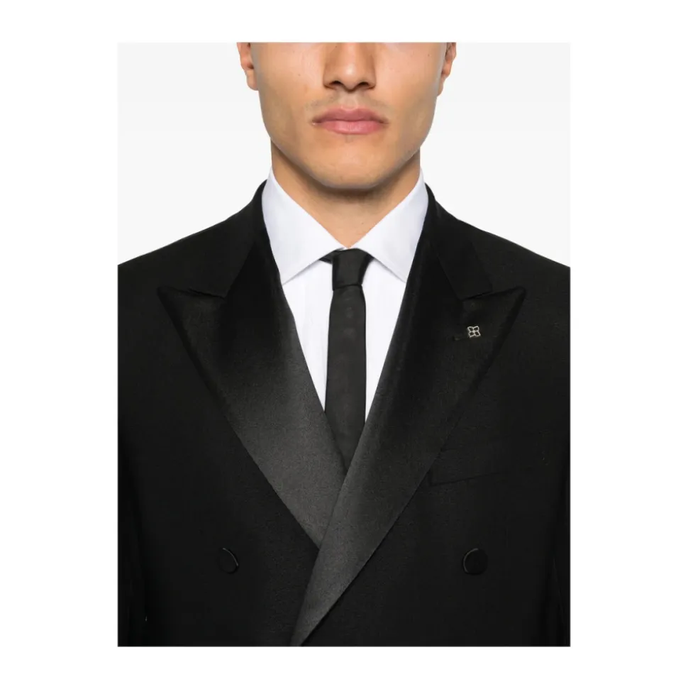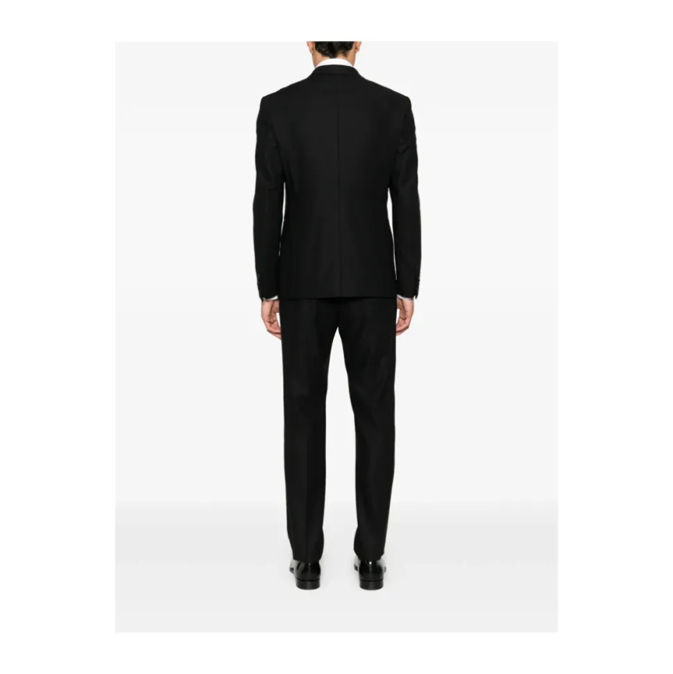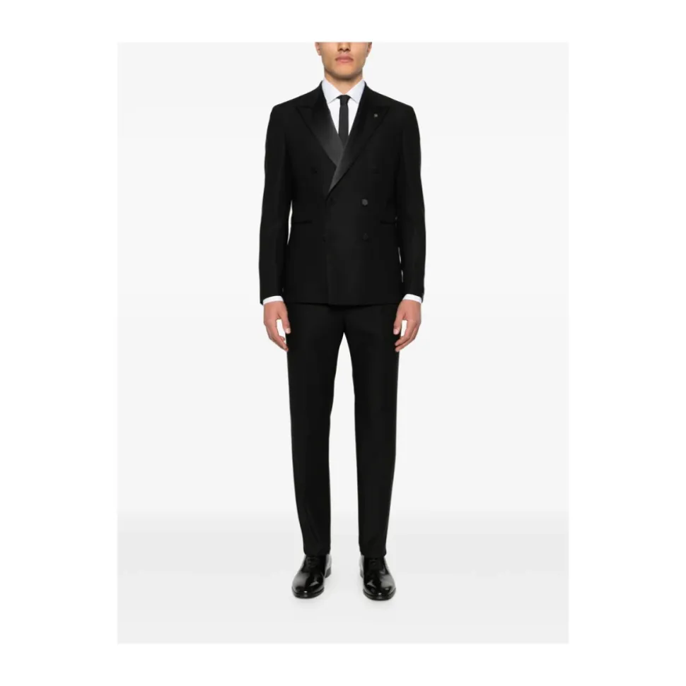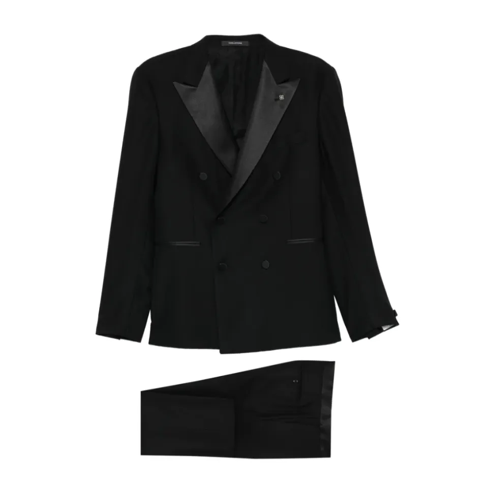 Tagliatore Dobbeltradet Smoking Suit kombinerer klassisk dobbeltradet skrædderi med satin-revers for formel beklædning og aftenbeklædning. Fremstillet i Italien af ren ny uld og designet til black-tie begivenheder og raffinerede looks. Nøgleattributter: Sort | Ren ny uld | Dobbeltradet lukning | Knaplukning | To forlommer | Matchende bukser med lynlås og hægtelukning | Satin-revers | Dobbeltradet silhuet | Central slids bagpå | Skræddersyede bukser med satinbånd | Dimensioner & pasform: Slim fit | Sammensætning & pleje: 100% ren ny uld | Kun kemisk rensning.