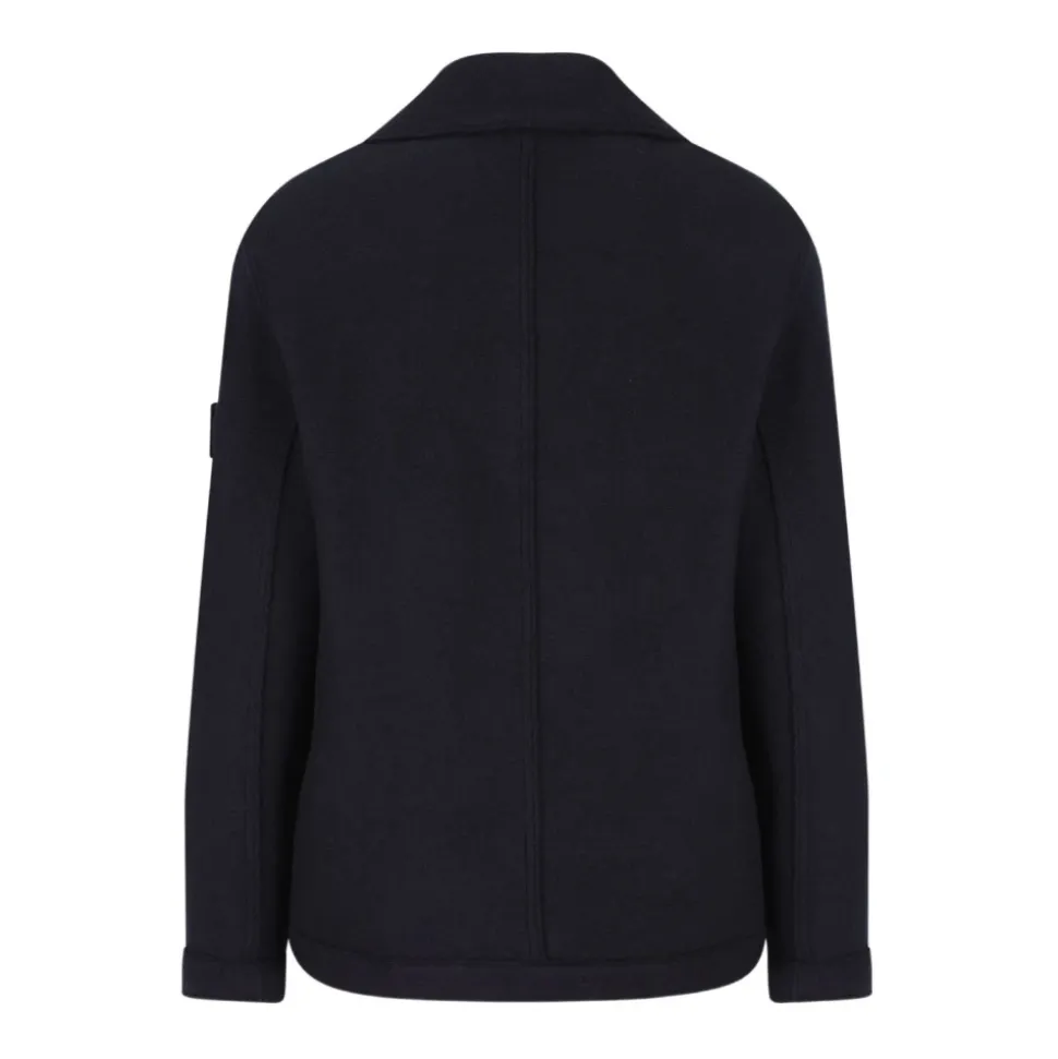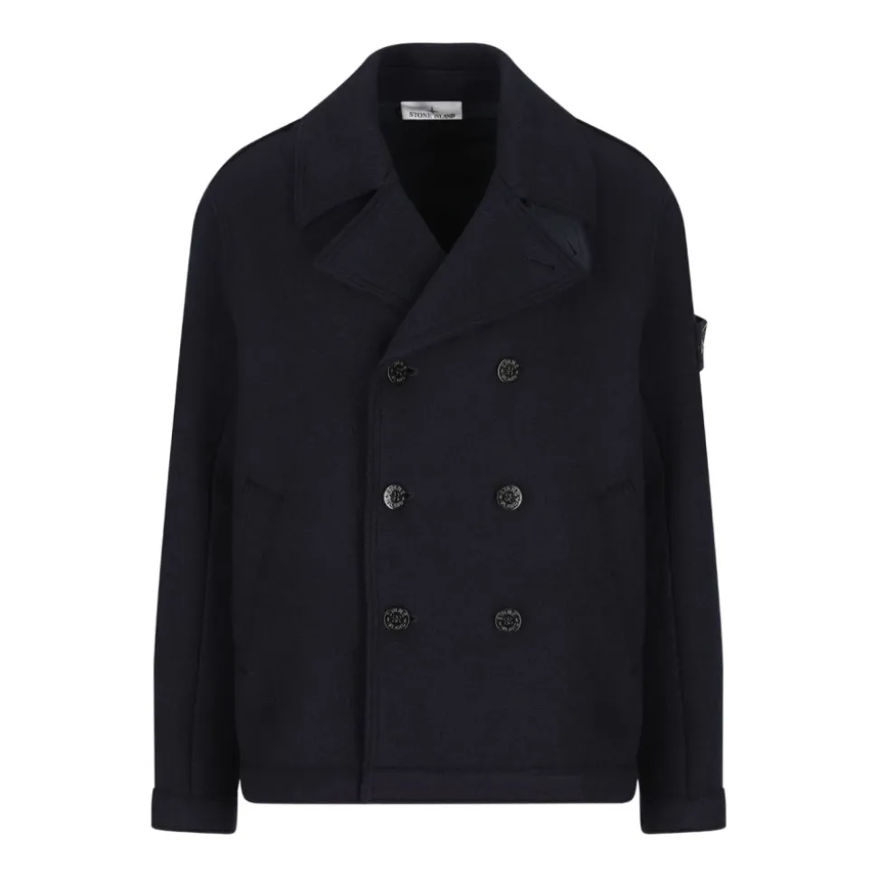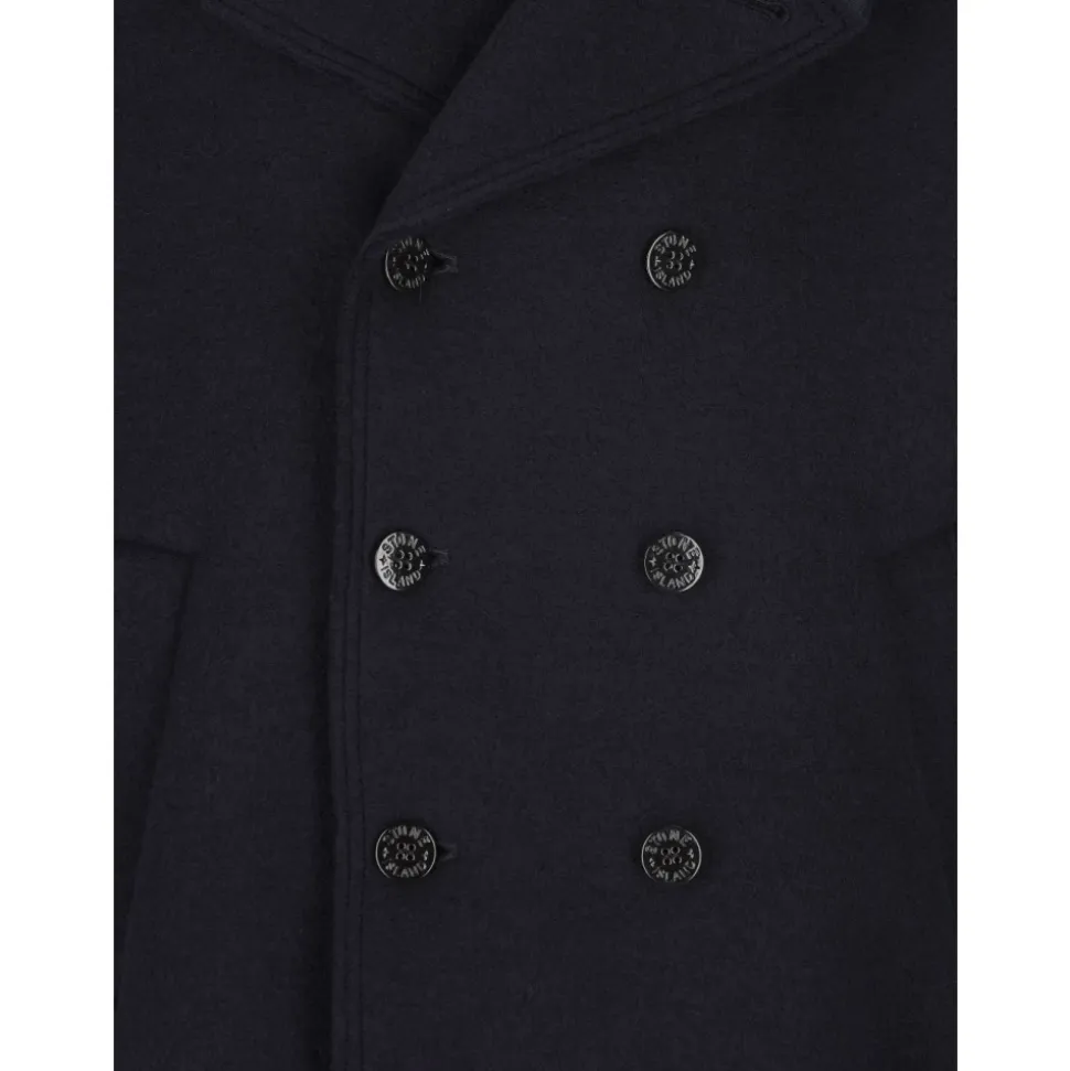 Stone Island Double-breasted Pea Coat fortolker den klassiske sømandskravefrakke med en oversized silhuet og RWS-filtuldskonstruktion for tekstureret varme og struktureret lagdeling. Nøgleattributter: Blå | Marineblå | RWS-filtuld | Knaplukning foran | Hagestrop med knaplukning | Udvendige håndlommer | Double-breasted design | Høj hals | Hakket revers | Underkrave i nylon twill | Signaturlogomærke på ærmet | Dimensioner og pasform: Oversized pasform | Sammensætning og pleje: Beklædning: 100% ny uld | Detaljer: 100% polyamid | Detaljer: 100% polyurethanharpiks