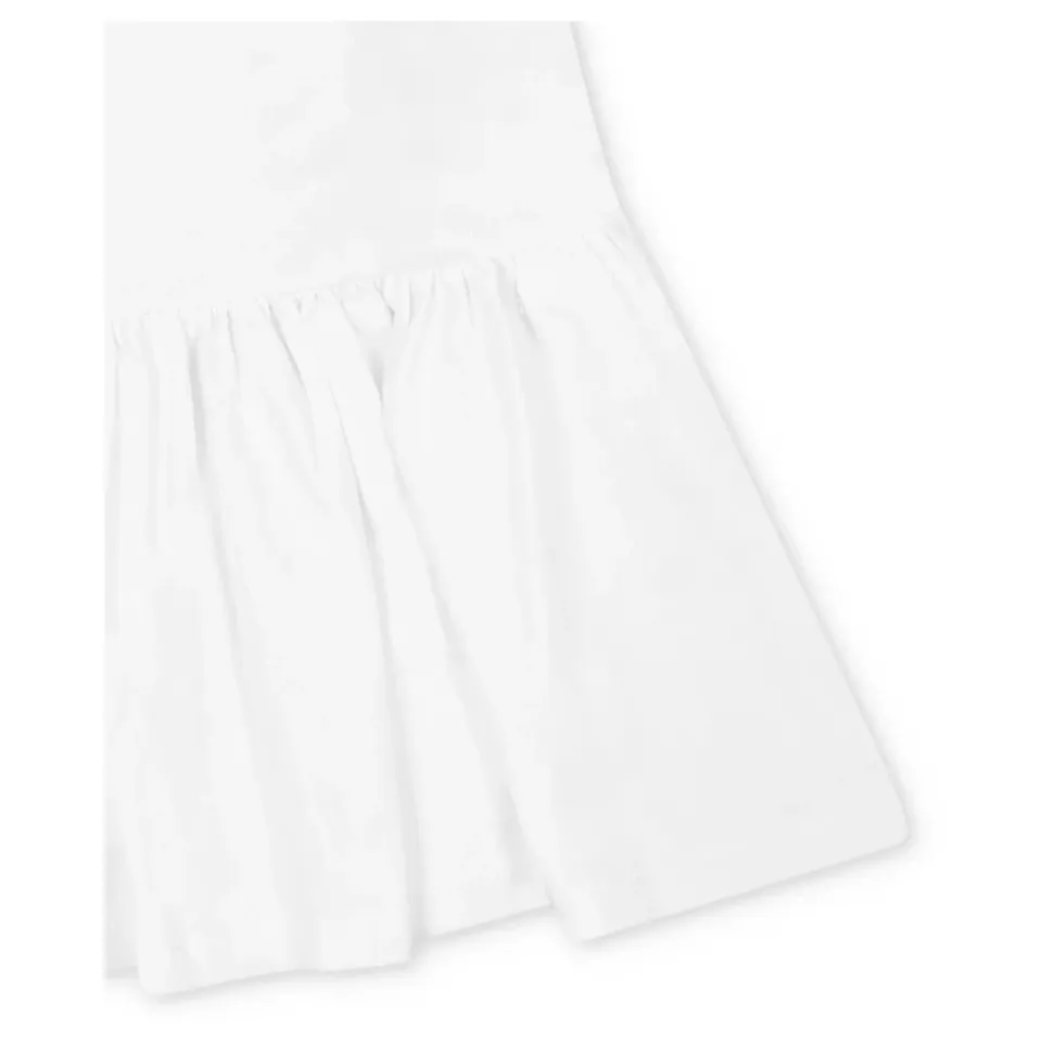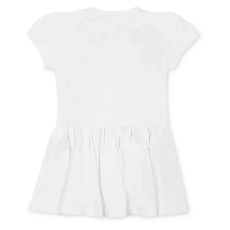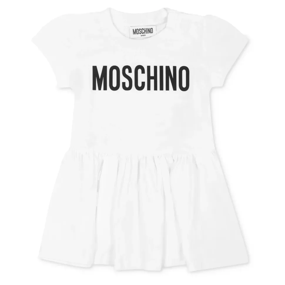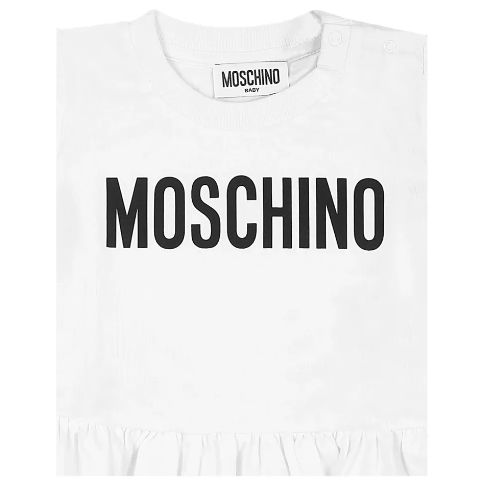 Moschino kjole i blød bomuld, med et signaturlogo foran og en flæsekant for et legende, men praktisk look med lette skulderknapper. Vigtigste egenskaber: Hvid | Bianco | Bomuld | Trykknaplukning ved skulderen | Korte ærmer | Ribstrikket rund halsudskæring | Flæsekant | Sort logo foran | Dimensioner og pasform: Komfortabel pasform | Sammensætning og pleje: 100% bomuld | Undgå rens. Må ikke tørretumbles. Brug ikke blegemiddel. Stryg ved maks. 110°C. Brug et mildt vaskemiddel uden blegemidler. Følg vaskeanvisningerne.