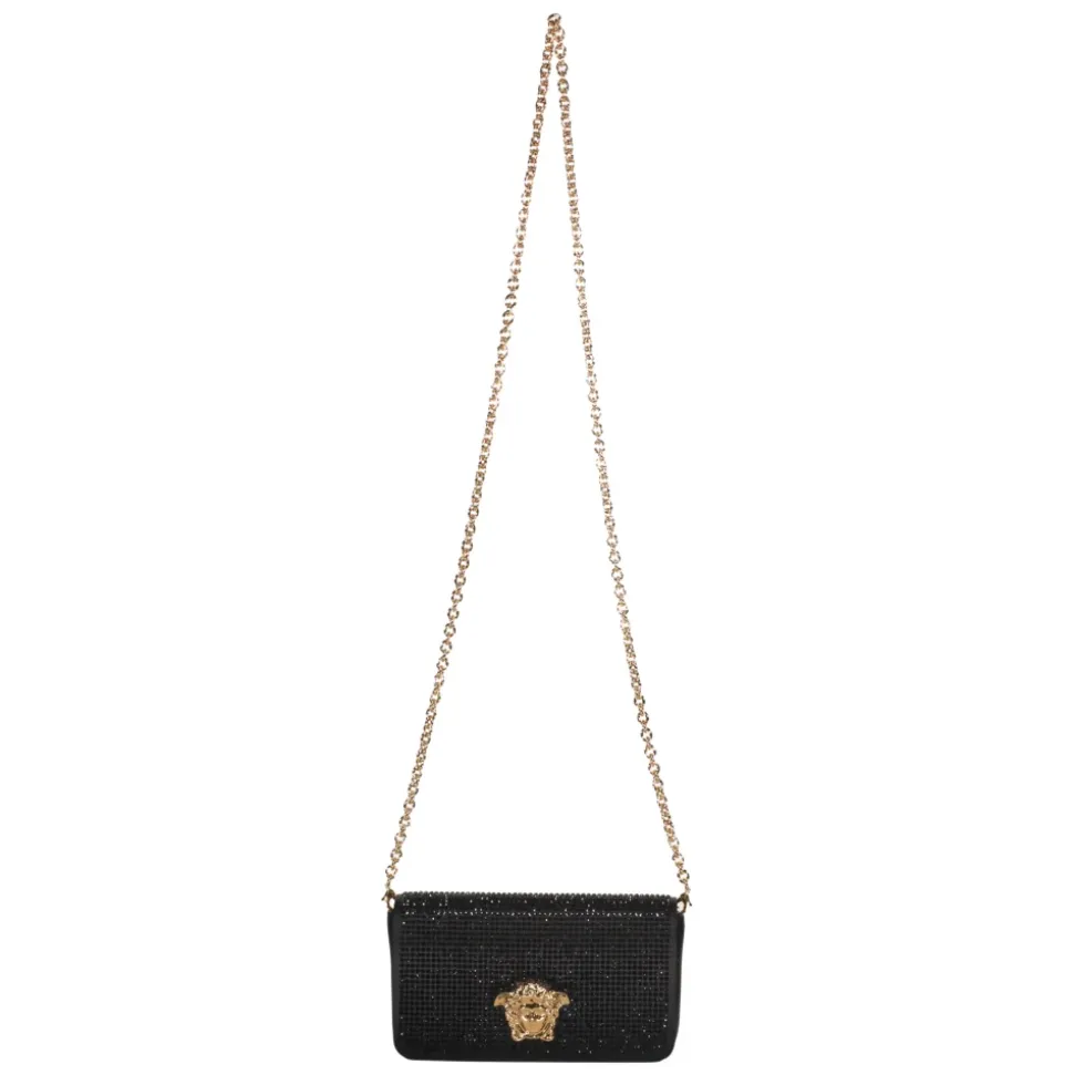 Versace Elegant Clutch er en kompakt crossbody taske, der kombinerer en sikker lukning med en gylden frontdetalje for raffineret stil og praktisk organisering. Nøgleattributter: Sort | Viskose | Sikker lukning | Tre kortlommer | Indvendigt rum | Lang skulderrem | Gylden frontdekoration | Kompakt rektangulær form | Strømlinet silhuet | Mål & pasform: Bredde: 18 cm | Højde: 10,5 cm | Dybde: 4 cm | Rem: 120 cm | Sammensætning & pleje: 72% Viskose | 28% Silke