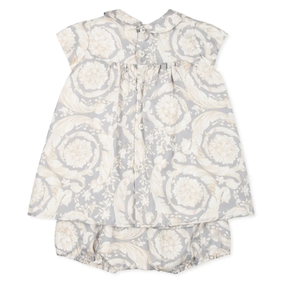 Versace præsenterer den elegante grå silkekjole med Barocco-print, et luksuriøst ensemble med en charmerende Peter Pan-krave og matchende shorts. Sættet er udsmykket med et all-over Barocco-print og er perfekt til særlige lejligheder. Produkt detaljer: Grå | Silke | Elastisk talje | Elastisk kant | Peter Pan-krave | Korte ærmer | All-over Barocco-print | Sammensætning og pleje: 100% Silke | Renseri anbefales