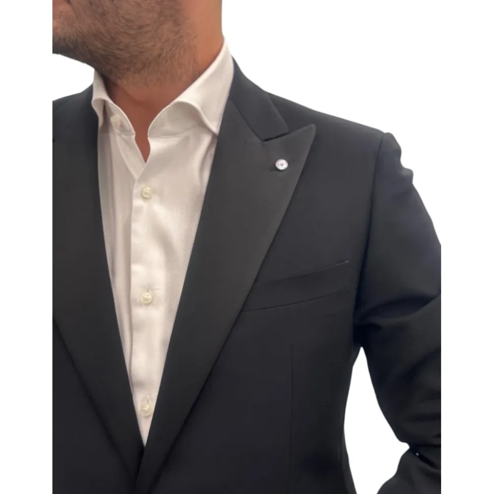 Oplev Luigi Bianchi Mantova Elegant Smoking Suit, et sofistikeret valg til formelle lejligheder. Dette enkeltknappede jakkesæt er fremstillet med præcision og udstråler tidløs stil. Produkt detaljer: Sort | Uld | Åndbart stof | Enkeltknappet lukning | Revers med hak | Knapmanchetter | Dimensioner og pasform: Regular fit | Sammensætning og pleje: 100% Uld | Renses kun.