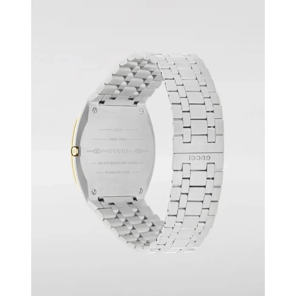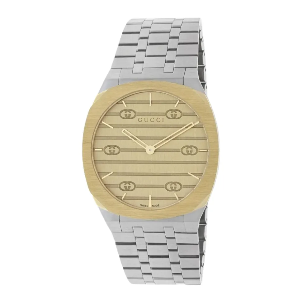 Forøg din stil med dette Gucci tofarvede ur, en perfekt blanding af klassisk elegance og moderne design. Fremstillet med præcision, dette schweizisk-lavede ur har et poleret metalarmbånd og en sofistikeret beige urskive, der tilbyder både stil og pålidelighed for den moderne mand.