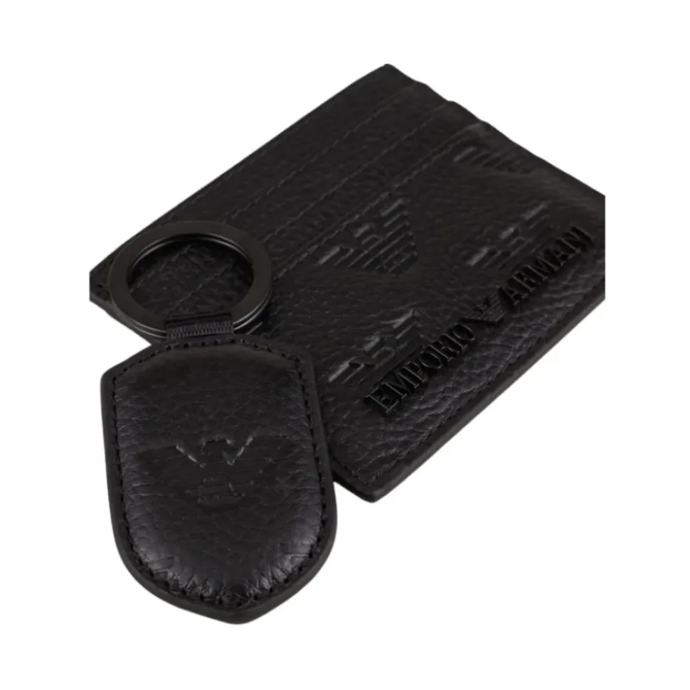 Løft din stil med Emporio Armani Embossed Eagle Læder Kortholder og Nøglering Sæt, designet til dem, der sætter pris på raffinerede accessories. Dette elegante sæt er perfekt til at organisere dine vigtigste ting og tilføje et strejf af elegance. Produkt detaljer: Sort | Kølæder | Præget ørne design | Sammensætning og pleje: 100% Kølæder | Aftørres med en blød klud.