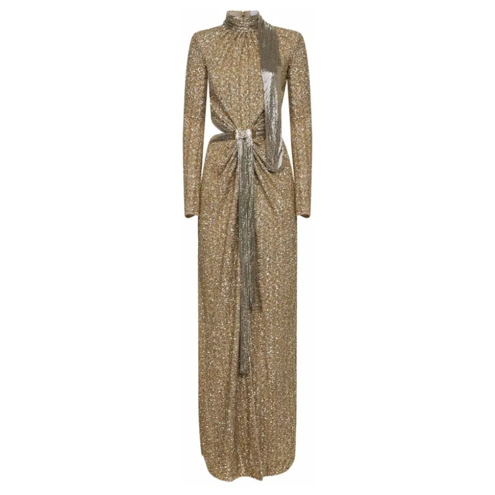 Rabanne broderet pailletkjole med karakteristiske metalnetdetaljer, designet til formelle lejligheder og aftenarrangementer. Med all-over broderede pailletter på en chiffonbase og skulpturelle metalindsatser for en markant silhuet. Vigtige egenskaber: Gul | Lys guld | Aluminium | Lynlåslukning bagpå i top og nederdel | Selvbindende metalnet lavallière-slips | Stående metalnetkrave | Rynkedetaljer foran | Lange ærmer | All-over broderede pailletter på chiffonbase | Udskæringer i taljen og hofterne | Præget metalplade foran i taljen | Metalnetindsatser | Mål og pasform: Almindelig pasform | Sammensætning og pleje: 50% aluminium | 25% polyamid | 25% polyester