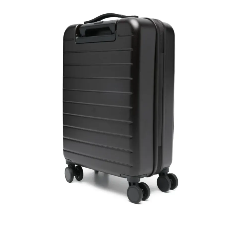 Emporio Armani kabinekuffert med et ibenholtsbrunt tophåndtag og letløbende hjul, med en kombinationslås og en indvendig netlomme til organiseret rejse. Nøgleattributter: Brun | Ibenholtsbrun | Kabinestørrelse | Tophåndtag | Hjul | Kombinationslås | Indvendig netlomme | Logo plaque | Ibenholtsbrun finish