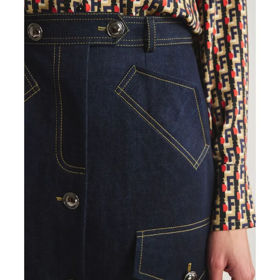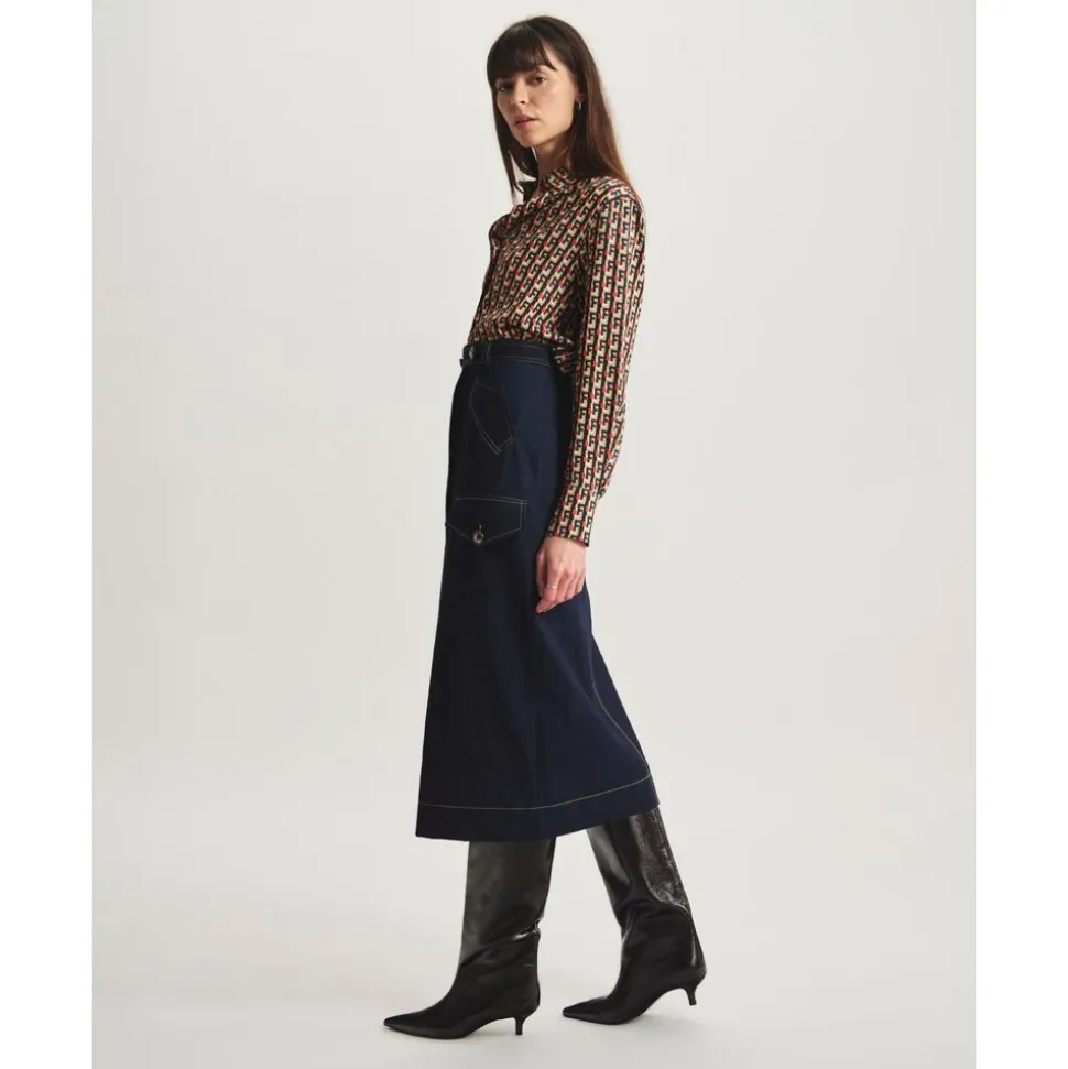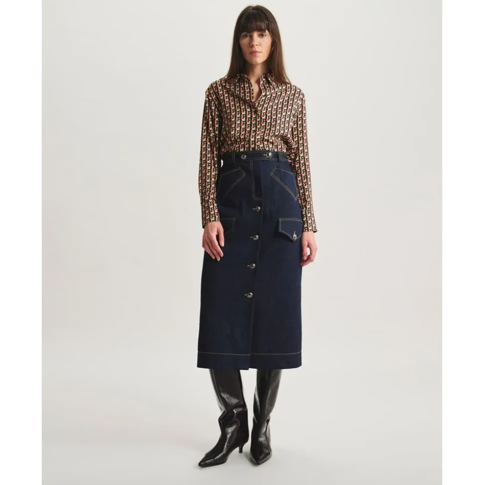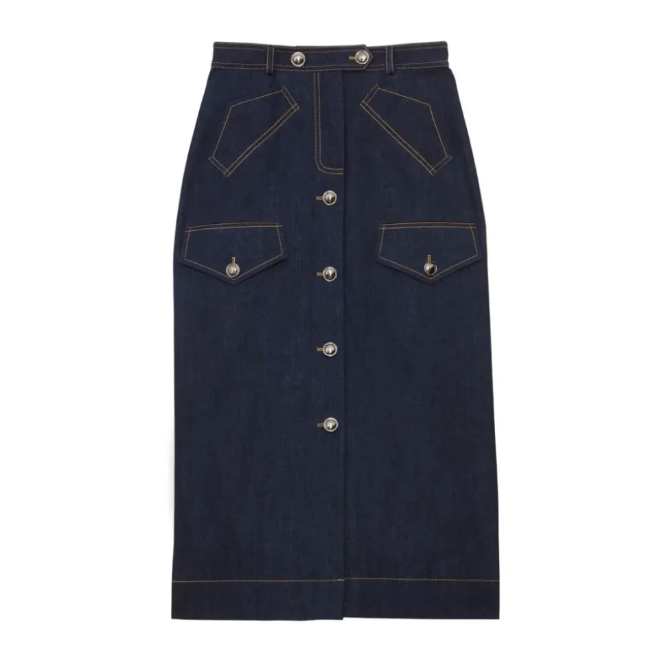 Ines de la Fressange Paris Eral Skirt kombinerer skræddersyede linjer med afslappede denimdetaljer for et hverdagsagtigt, urbant look. Klaplommer og en knaplukning foran giver praktisk karakter og nem styling. Vigtige egenskaber: Mørkeblå denim | Blå | Bleu marine | Bomuld | Knaplukning midt foran | Klaplommer | Bæltestropper | Paspolerede lommer med frontklap | Knapdekoration foran | Mål og pasform: Lige snit | Midi-længde | Sammensætning og pleje: Bomuld