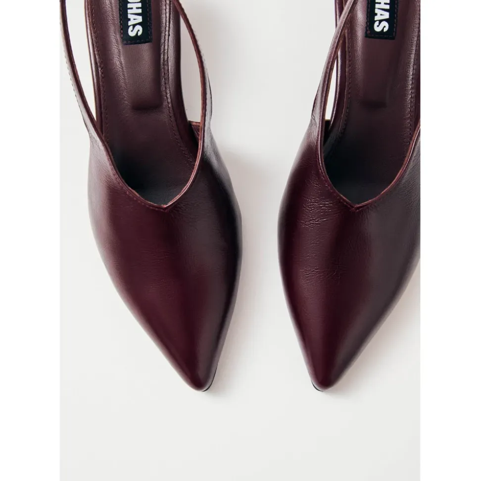 Eros Pumps fra ALOHAS er fremstillet i burgunderfarvet læder med krøllet effekt, der kombinerer stil og komfort med en lav 4 cm hæl og elastisk slingback-rem. Produkt detaljer: Burgunder | Læder med krøllet effekt | Elastisk slingback-rem | Spids tå | Minimalistisk lang overdel | Dimensioner og pasform: Størrelsesrigtig | Sammensætning og pleje: Overdel: 100% Kødkvægslæder | For, indlægssål: 100% Gedlæder | Ydersål: 100% Cuerolite | Ikke specificeret