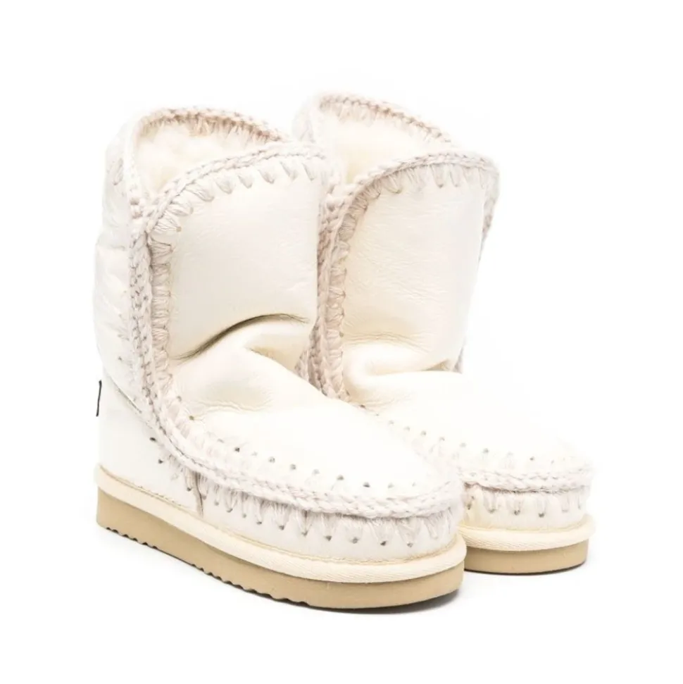 Mou Eskimo 24 Boot kombinerer brandets karakteristiske hæklede syninger med en blød shearling-foring for pålidelig varme og hverdags vinterbrug. Den mellemhøje silhuet og forstærkede konstruktion gør den velegnet til outfits i koldt vejr. Vigtige egenskaber: Bianco gesso | Fåreskind | Isolerende foring | Holdbar gummi/EVA ydersål | Shearling-foring for varme | Slip-on (pull-on) indgang | Forstærket hæl | Hæklet syning trim | Rund tå | Logo bagpå | Mellemhøjt skaft | Dimensioner & pasform: Skaft højde: 24 cm | Regular fit | Mellemhøj støvle | Sammensætning & pleje: Foring: shearling 100% | Sål: gomma 100% | Overdel: montone 100%