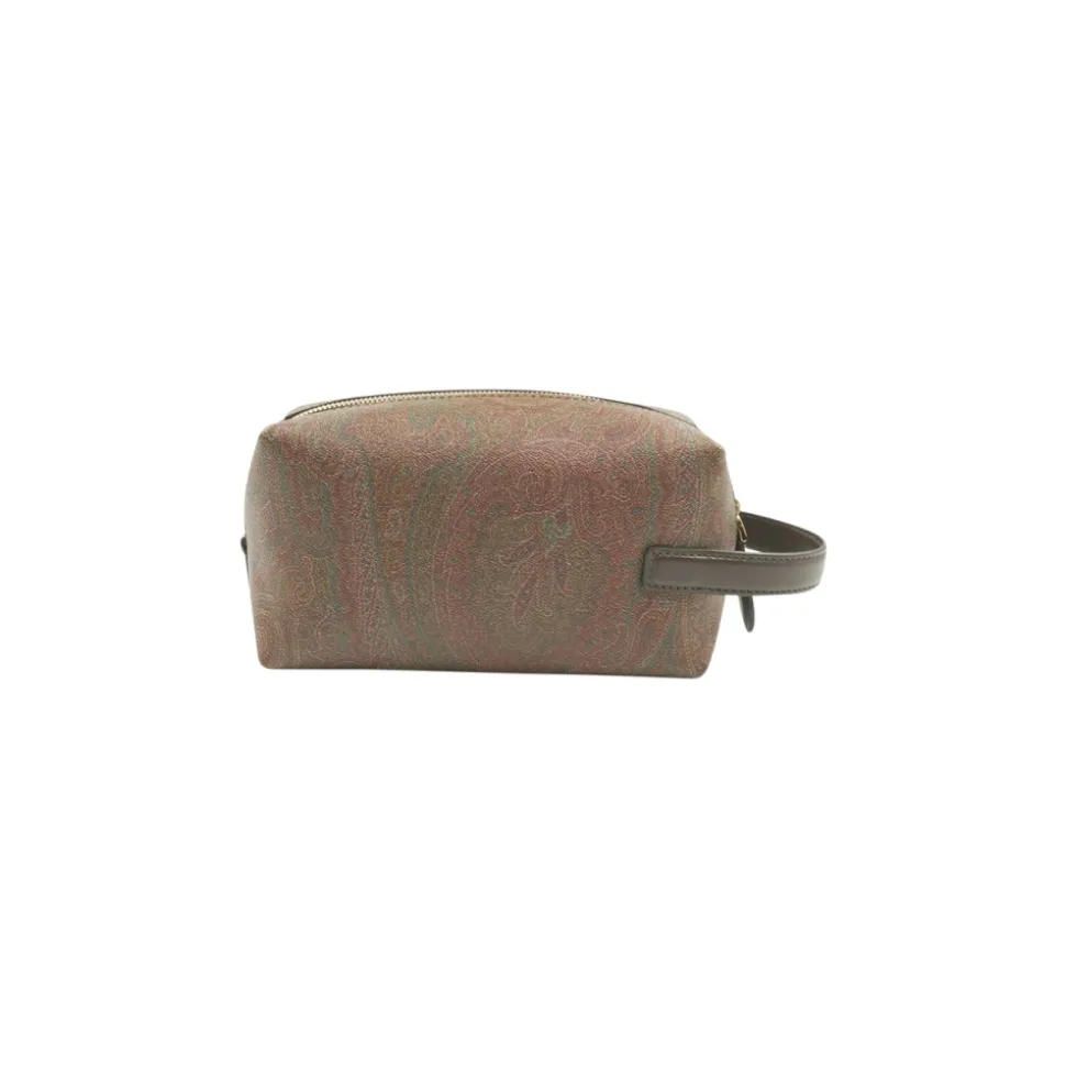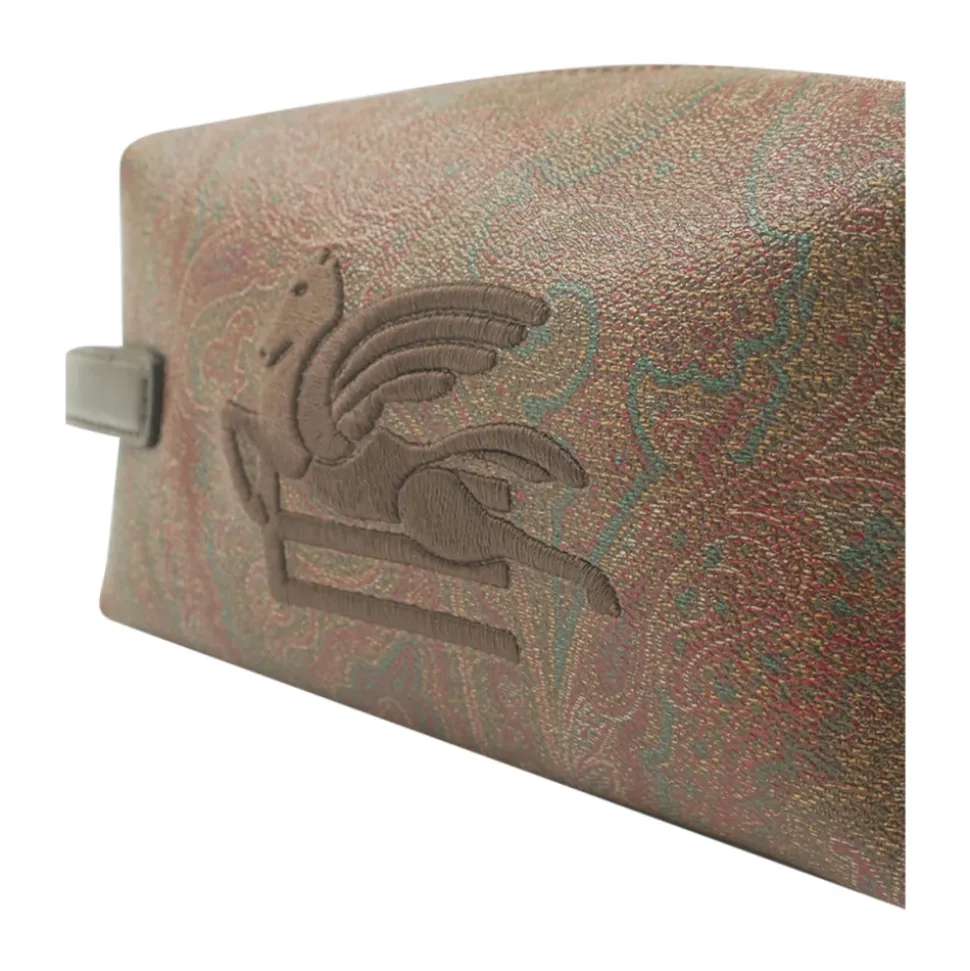Etro Essential Small Jacquard Pouch er et kompakt tilbehør udført i husets signatur Paisley jacquard. Den er afsluttet med tredimensionelt Pegaso-broderi og et sidehåndtag i læder, der gør den nem at bære. Nøgleattributter: Brun | Bomuldsjacquard | Lynlåslukning | Sidehåndtag | Paisley jacquard-mønster | Tredimensionelt Pegaso-logobroderi | Kompakt rektangulær form | Dimensioner og pasform: Bredde: 19,5 cm | Højde: 10 cm | Dybde: 8 cm | Sammensætning og pleje: Yderstof: Paisley bomuldsjacquardstof (belagt) | Belægning: 100% PVC | Detaljer: Kalveskind | Foring: 100% polyester