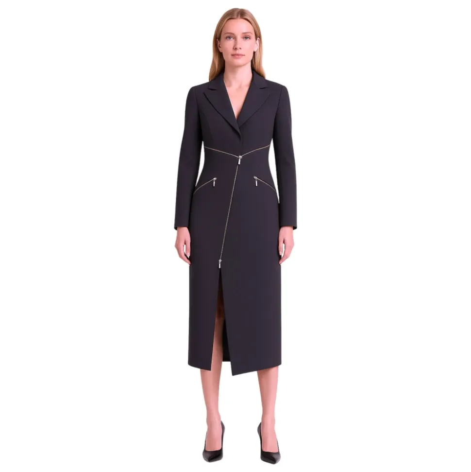 Babylon præsenterer Eureka Dress, en elegant, skulpturerende model i flydende, teknisk stof med asymmetriske guldlynlåse og en bred revers for en moderne, skræddersyet silhuet. Nøgleegenskaber: Grå | Grå | Polyester | Skulpturerende teknisk stof | Stræk for komfort | Glat drapering | Asymmetrisk lynlås foran | Dekorative og funktionelle guldlynlåse | Slids foran | Bred revers | Skræddersyet snit | Asymmetriske lynlåsdetaljer | Slids foran | Mål og pasform: Længde (størrelse 40 IT): 101 cm | Figursyet over brystet | Let udvidet ved sømmen | Sammensætning og pleje: 88% Polyester | 12% Elastan