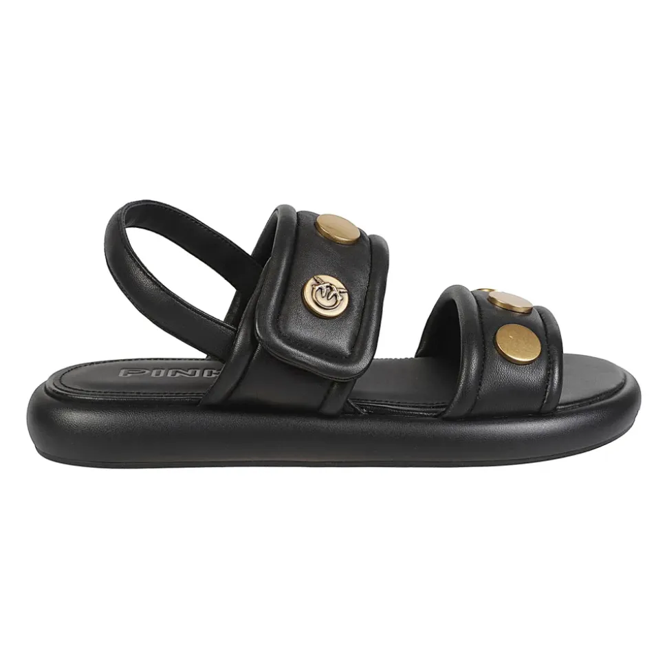 Pinko Fiona 01 Sandal kombinerer kalveskind med nitter og en slingback-silhuet for en flad, raffineret sandal. Den er designet til et poleret hverdagslook og nem city-styling. Vigtige egenskaber: Sort | Kalveskind | Slingback-rem | Flad sål | Guld-tone nitter | Logo detalje | Åben tå | Sammensætning og pleje: Ydre: Kalveskind 100,0% | For: Kalveskind 100,0% | Sål: Gummi 100,0%