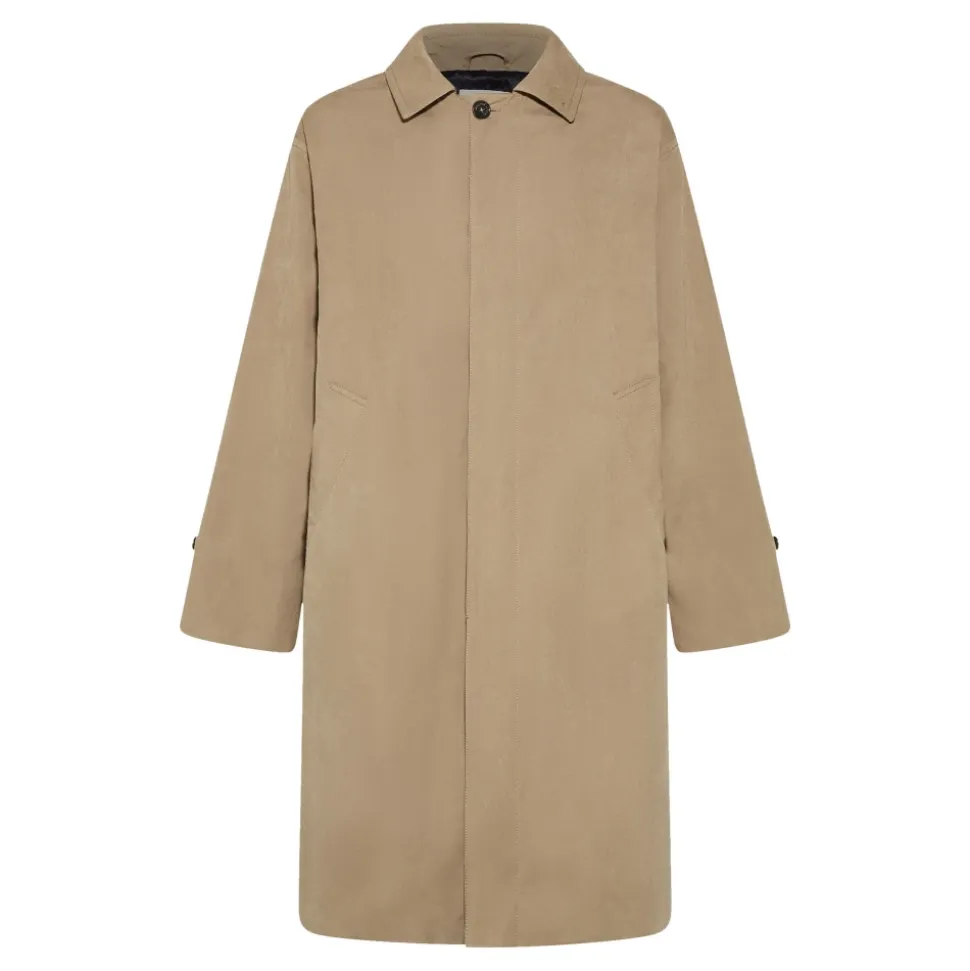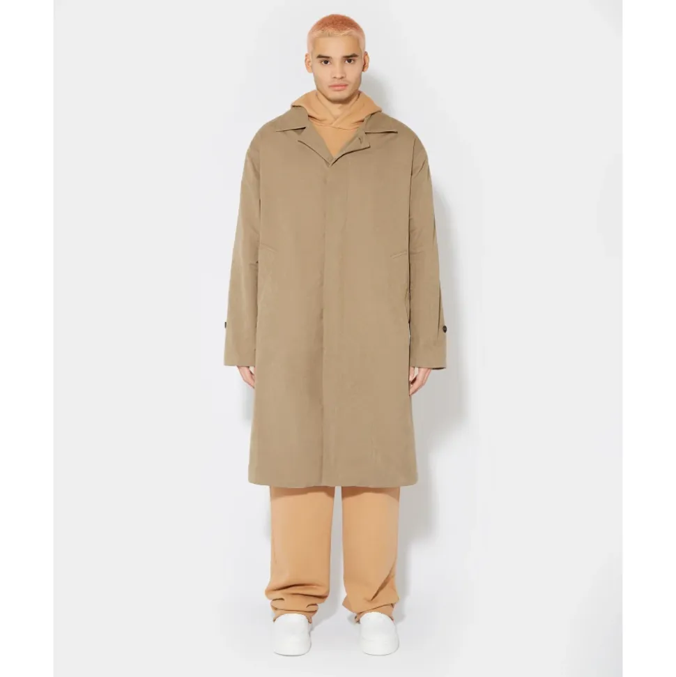 Urban-stil trenchcoat lavet af teknisk bomuldsstof med raglanærme på skuldrene, bagventilation og tøjler på håndledene.