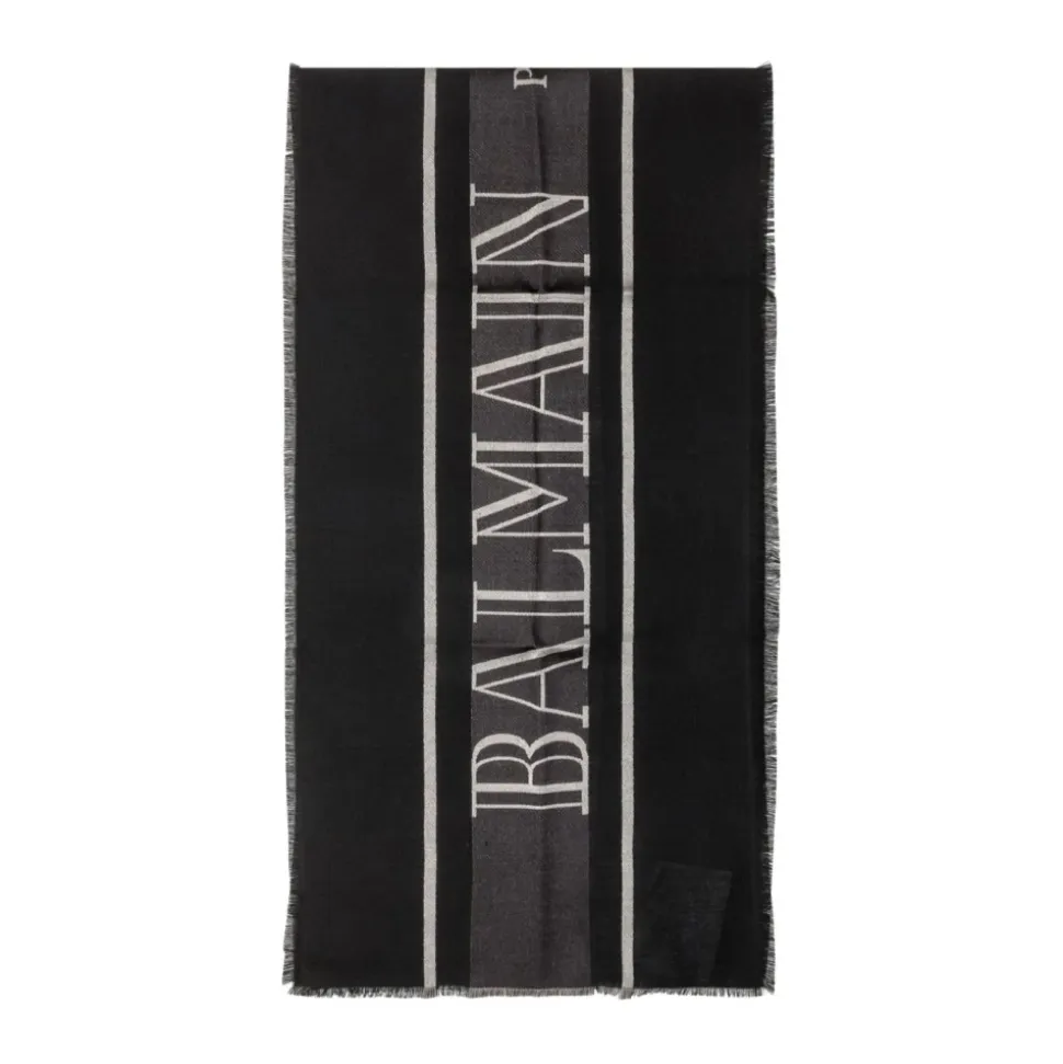 Balmain frynset logo halstørklæde tilføjer et markant præg til outfits med et kontrasterende logo og frynset kant. Fremstillet af en blød viskose- og polyesterblanding, designet til alsidig hverdagsbrug. Vigtigste egenskaber: Sort | Nero avorio | Viskose og polyester | Kontrasterende logo | Frynsede kanter | Blødt fald | Dimensioner & pasform: One size | Sammensætning & pleje: Viskose | Polyester