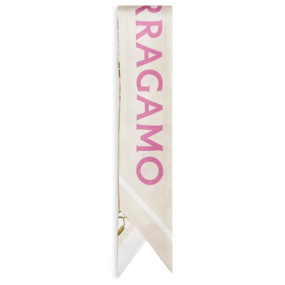 Ferragamo Gaia Print Bandeau fra Ferragamo er et smalt silketwill-tørklæde med en ensfarvet yderside og en flerfarvet Gaia-printet inderside. De kontrasterende kanter og slanke form gør det ideelt som et alsidigt hals- eller hårtilbehør. Vigtige egenskaber: Flerfarvet | Lys ballet | Elfenben | Silke | Vendbart design | Spidse kanter med kontrasterende stribet mønster | Ensfarvet silketwill-yderside med Ferragamo jacquard-signatur | Flerfarvet Gaia-printet silketwill-inderside | Mål og pasform: 140 x 7 cm | Materiale og pleje: 100% silke