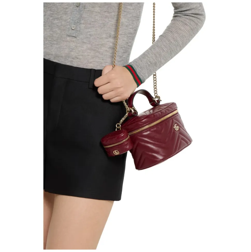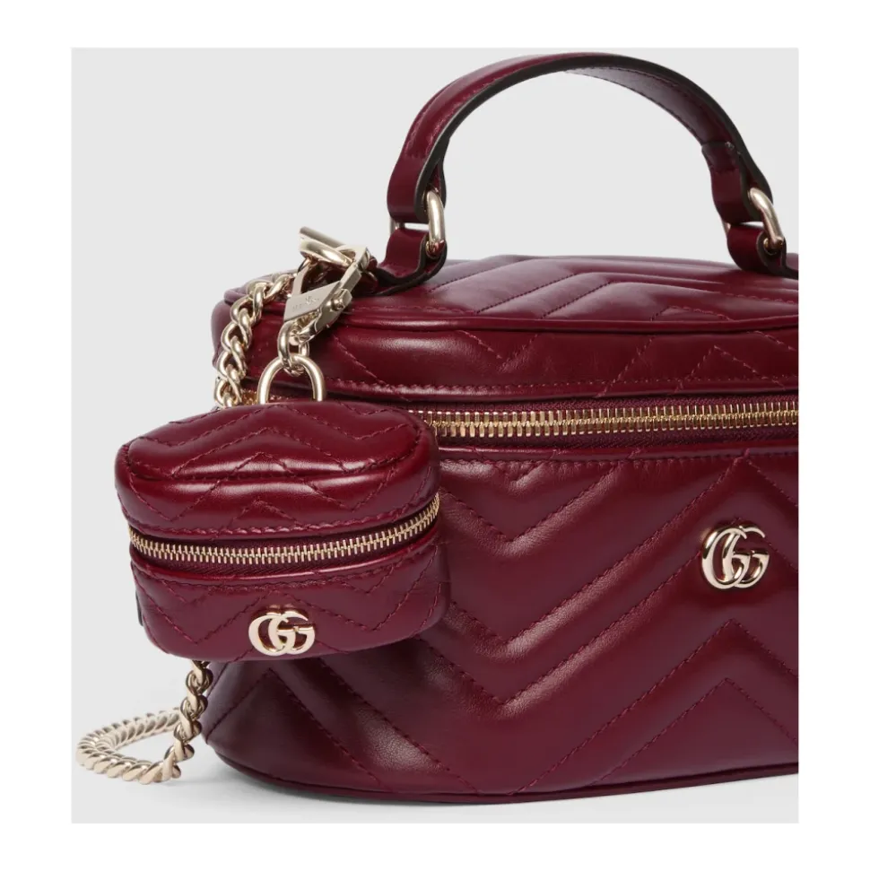 Guccis GG Marmont Key Case er en kompakt nøglepung med lynlås, udført i Rosso Ancora matelassé chevronlæder. Den er designet til at holde styr på nøgler og småting med en slank, lommevenlig profil. Vigtigste egenskaber: Rosso Ancora Red | Læder | Lynlåslukning | Indvendig nøglering | Udvendig flad lomme | Matelassé chevronmønster | Let guldfarvet Double G hardware | Rød taftforing | Mål og pasform: B10 cm x H7 cm x D4 cm | Sammensætning og pleje: Læder | Taftforing | Beskyt mod direkte lys, varme og regn. Tør straks med en blød klud, hvis den bliver våd. Opbevar i den medfølgende støvpose eller æske. Rengør med en blød, tør klud.