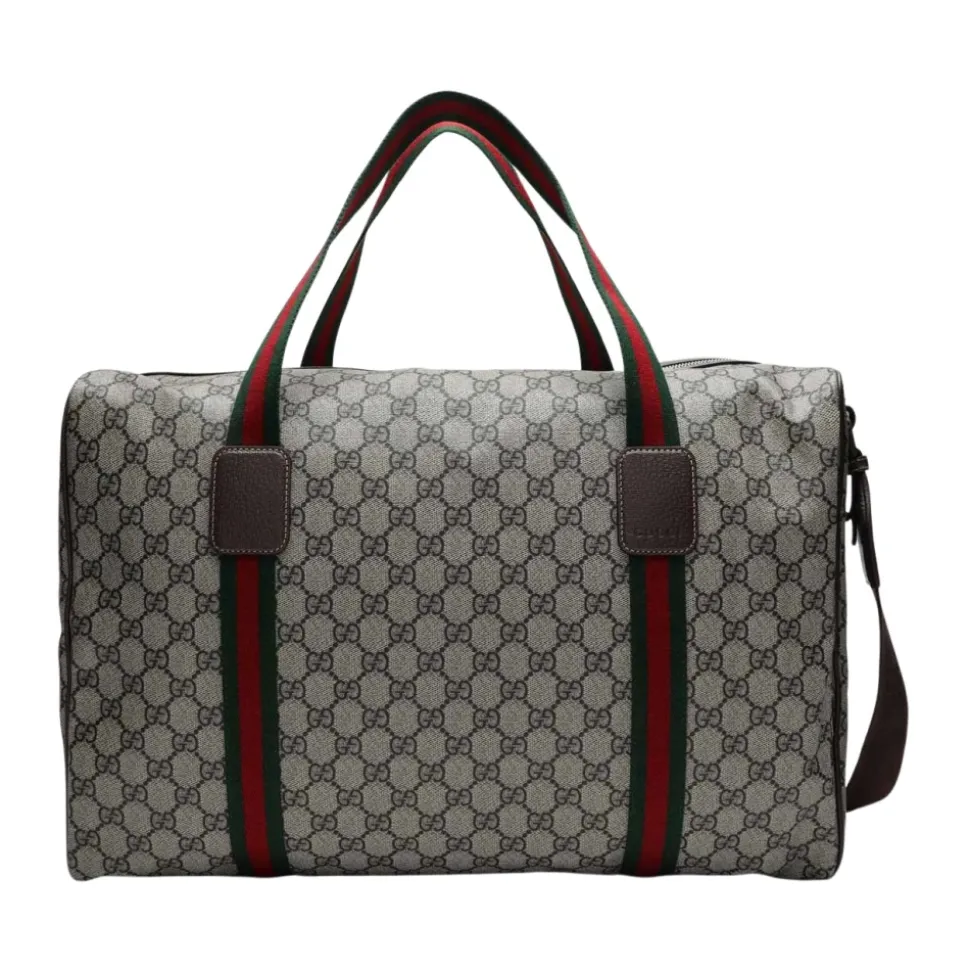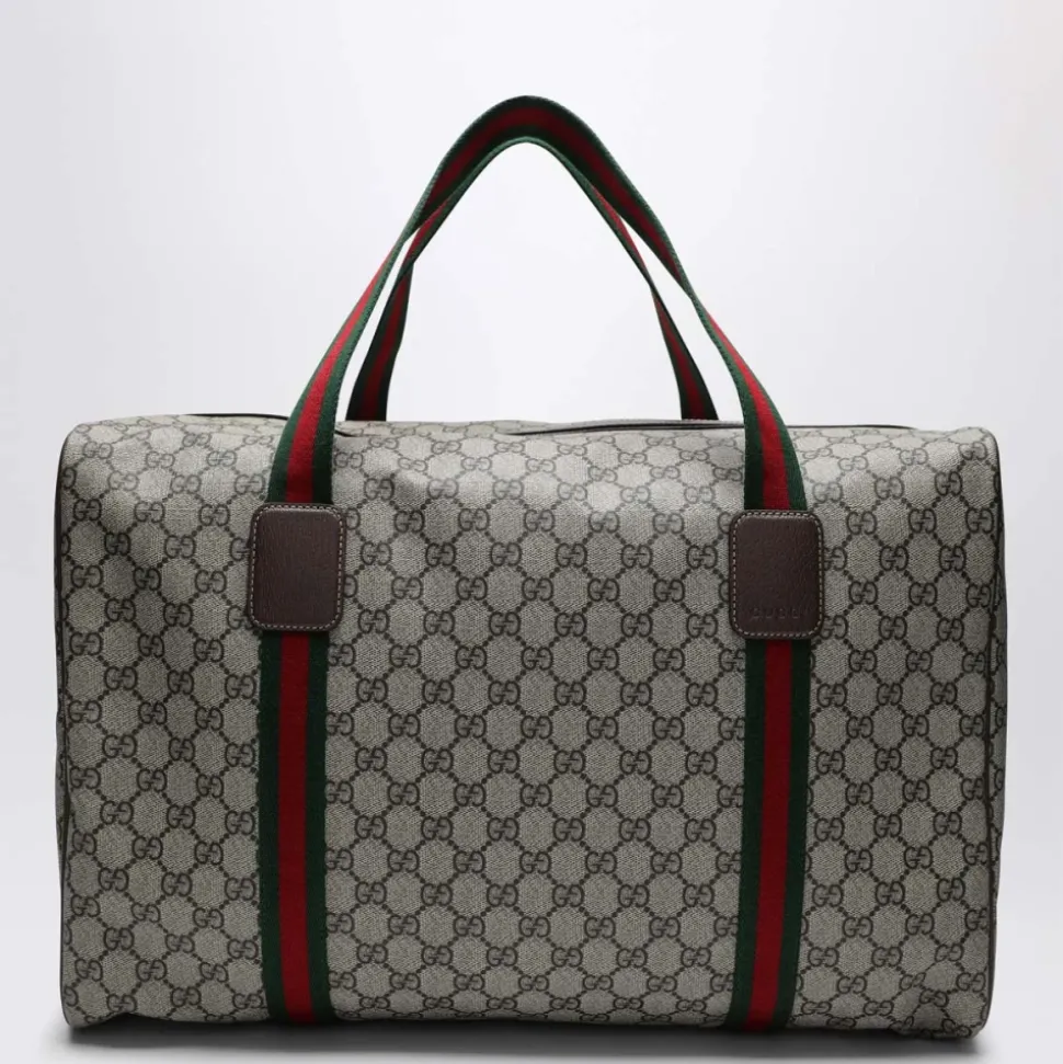 Gucci GG Supreme Duffle Bag er en medium re taske i GG Supreme stof med brandets signatur Web-bånd. Designet til weekendture, den kombinerer rummelig opbevaring med en klassisk monogram finish. Vigtigste egenskaber: Beige | Ebony | GG Supreme stof | Aftagelig, justerbar skulderrem | Dobbelte tophåndtag | Lynlåslukning | Indvendig lynlåslomme | Web-bånd detalje (grøn og rød) | GG monogram mønster | Læder trim med logo patch | Dimensioner & pasform: L: 45.5 cm x H: 29 cm x D: 27 cm | Sammensætning & pleje: 68% bomuld, 32% polyurethan