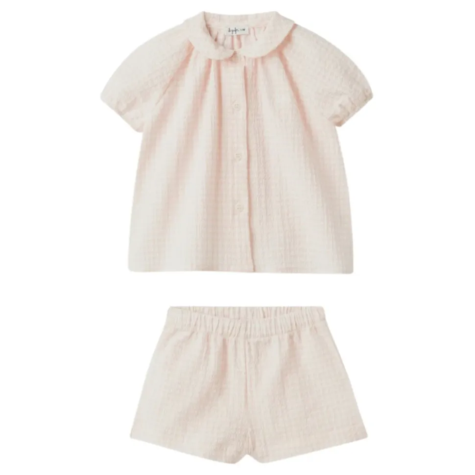 Il Gufo Gingham Seersucker Sæt kombinerer en tekstureret gingham seersucker skjorte med matchende shorts med elastik i taljen for komfortabelt, koordineret tøj til varmt vejr. Nøgleattributter: Pink | Bomuld | Let stretch for nem bevægelse | Knaplukning foran | Elastiske ærmekanter | Elastisk taljebånd | To-delt koordinerende sæt | Gingham ternet mønster | Rund krave | Pufærmer med elastisk finish | Knaplukning foran | Seersucker tekstur | Sammensætning & pleje: 97% bomuld, 3% elastan | Maskinvask 30°C. Må ikke bleges. Stryg ved lav temperatur. Må ikke tørretumbles. Rens (skånsomt). Tør fladt.