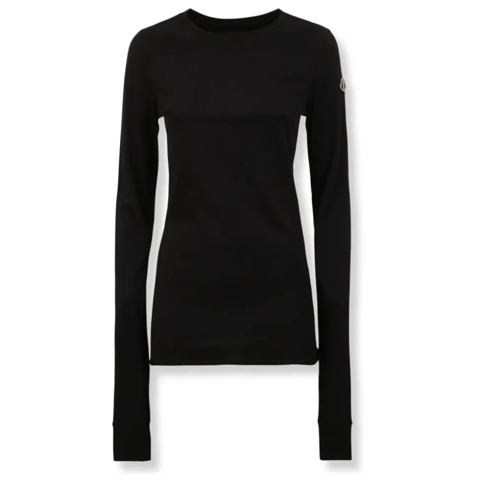 Moncler Girder LS T fra Moncler + Rick Owens samarbejdet er en langærmet bomuldsjersey top, der kombinerer en struktureret paneldetalje med en ren, minimalistisk silhuet. Den er designet til hverdagsbrug med et diskret, brandet mærke på overarmen. Nøgleattributter: Sort | Bomuld | Mellemvægt jersey | Kompakt strik | Let børstet håndfølelse | Rund halsudskæring | Lange ærmer | Afstivet panel på øvre bryst og skulder foran | Broderet logo mærke på venstre overarm | Paneldelt design | Dimensioner & pasform: Slank pasform | Sammensætning & pleje: 100% Bomuld