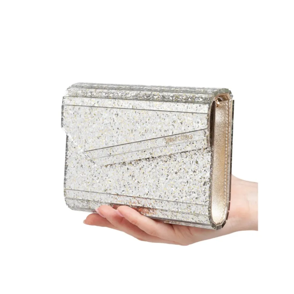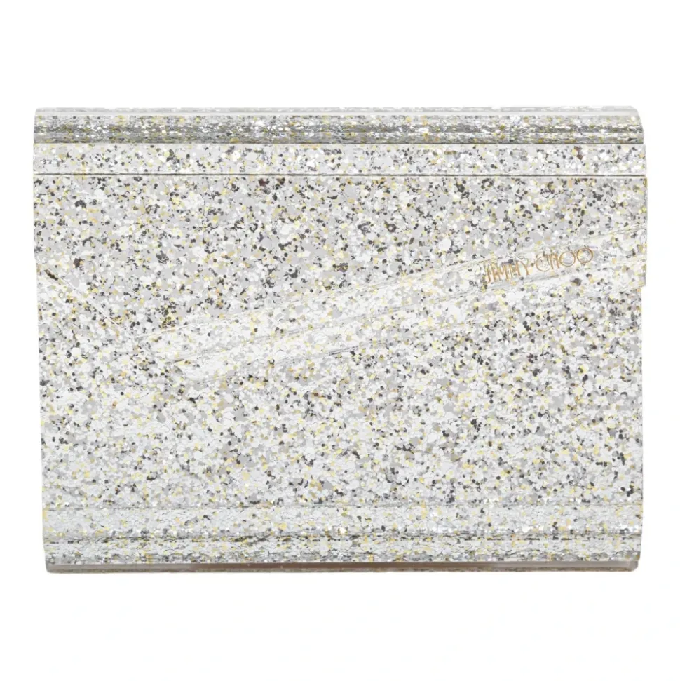 Forkæl dig selv med denne Jimmy Choo Candy clutch taske i Champagne farve. Lavet af akrylstof med rå glimmer, den har en asymmetrisk klap, kæde skulderrem, intern lomme med Jimmy Choo mærke, satinforing og magnetisk lukning. Lavet i Italien. Mål: Bredde 17 cm, Højde 11 cm, Dybde 4,5 cm, Skulderrem 55 cm.
