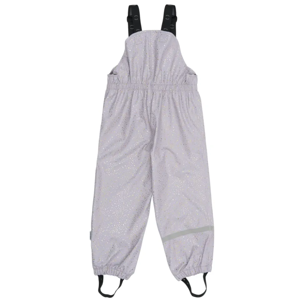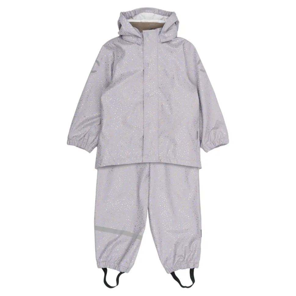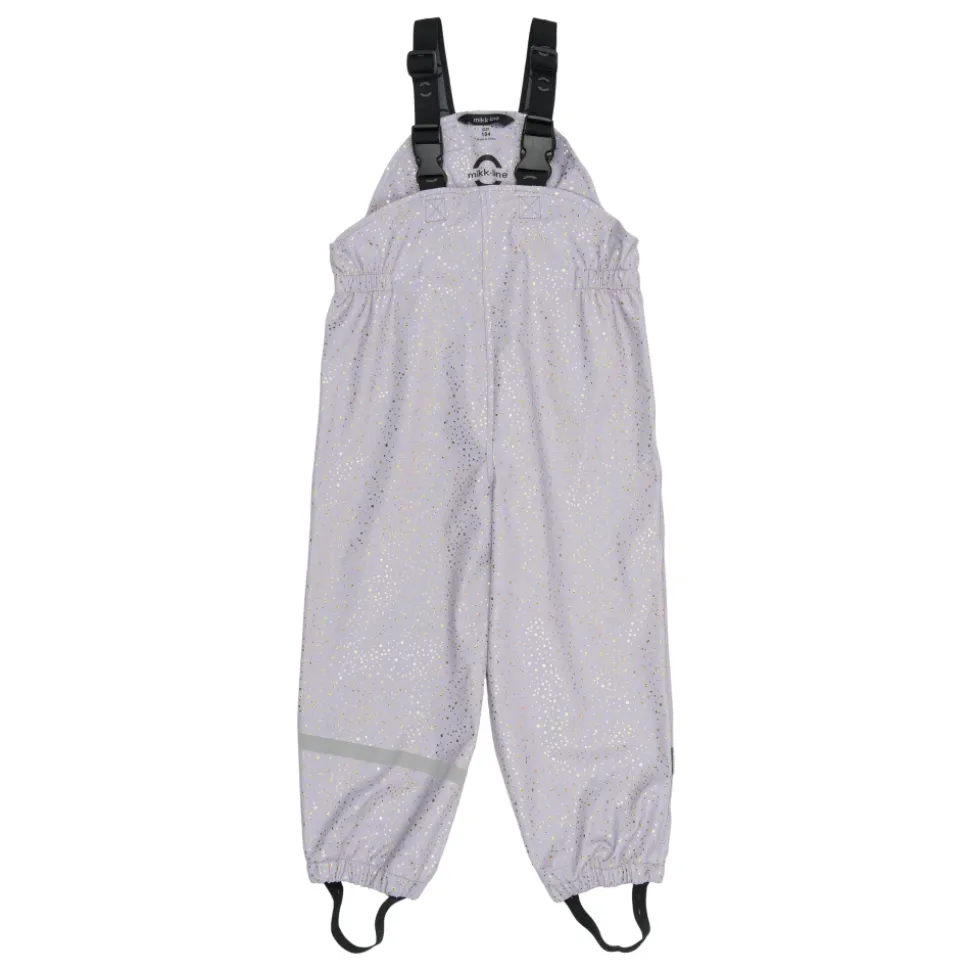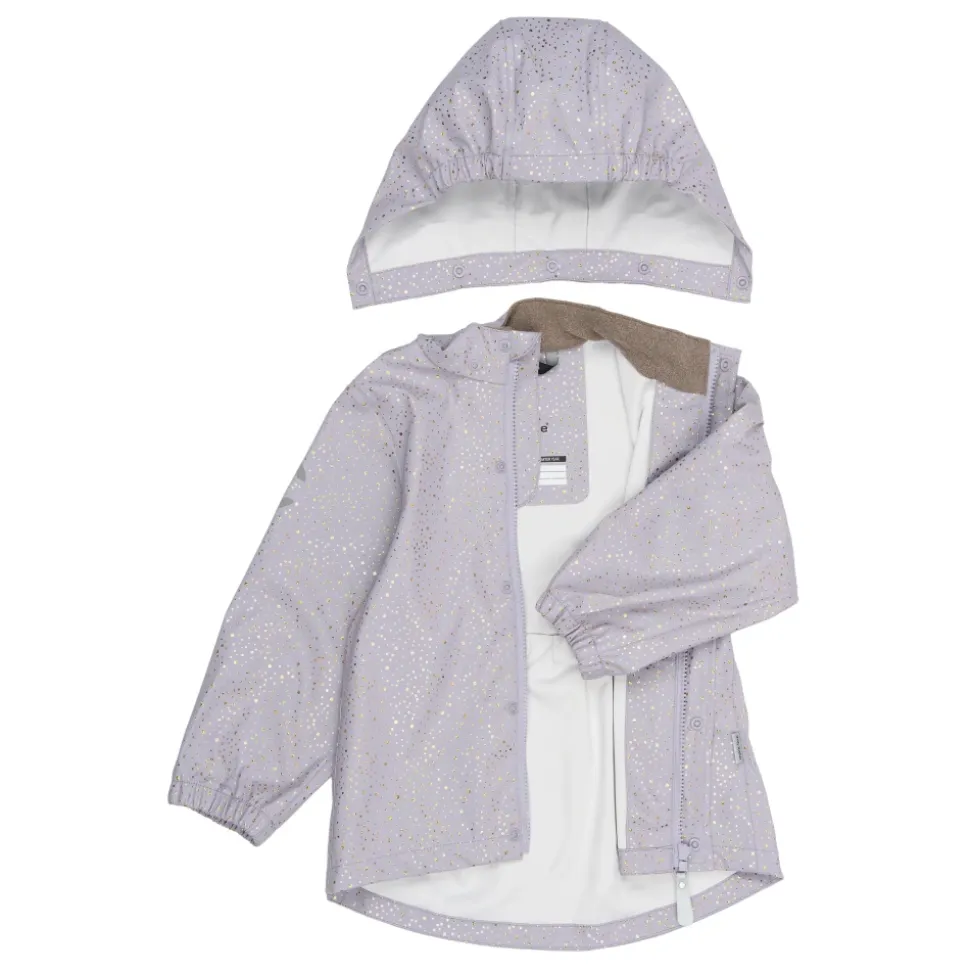 Mikk-Line – PU Glitter Rain Set, 3341 – Lavender Aura Skønt regnsæt til pigerne fra Mikk-Line. Dette i en flot lys lilla farve med multifarvet glimmer prikker over det hele.Sættet består af jakke samt bukser.Regnjakken har en gennemgående lynlås samt knapper foran.Jakken har et feminint snit og lidt ekstra længde bagpå end foran.Der er aftagelig hætte, som sider fast med knapper. Der er elastik kanter omkring håndleddene samt i åbningen på hætten.På begge ærmer samt nederst på ryggen er der en refleks, så barnet lettere bliver set i de mørke timer.Regnbukserne er med seler til og med str. 104 – fra str. 110 er der elastik i livet.Der er elastik kanter omkring anklerne, så buksebenene ikke glider ned over fødderne.Der er elastikstropper under fødderne, som kan sættes under gummistøvlerne, så regnbukserne ikke glider op ved f.eks. leg.Nederst på venstre ben er der to striber refleks, for god synlighed. Materiale: Ydre: 100% polyurethanForing: 100% polyester Rart at vide:Vandtæt (WP): 5.000 mmVindtætSvejsede sømmeSeler til og med str. 110Reflekser på jakke og buks; Reflekserne er godkendt i henhold til EN 471 standard og er synlige i en afstand på op til 140 meter Vask: 30 grader skånevaskHusk at følge vaske- og brugsanvisningStyle no.: 3341_Lavender Aura
