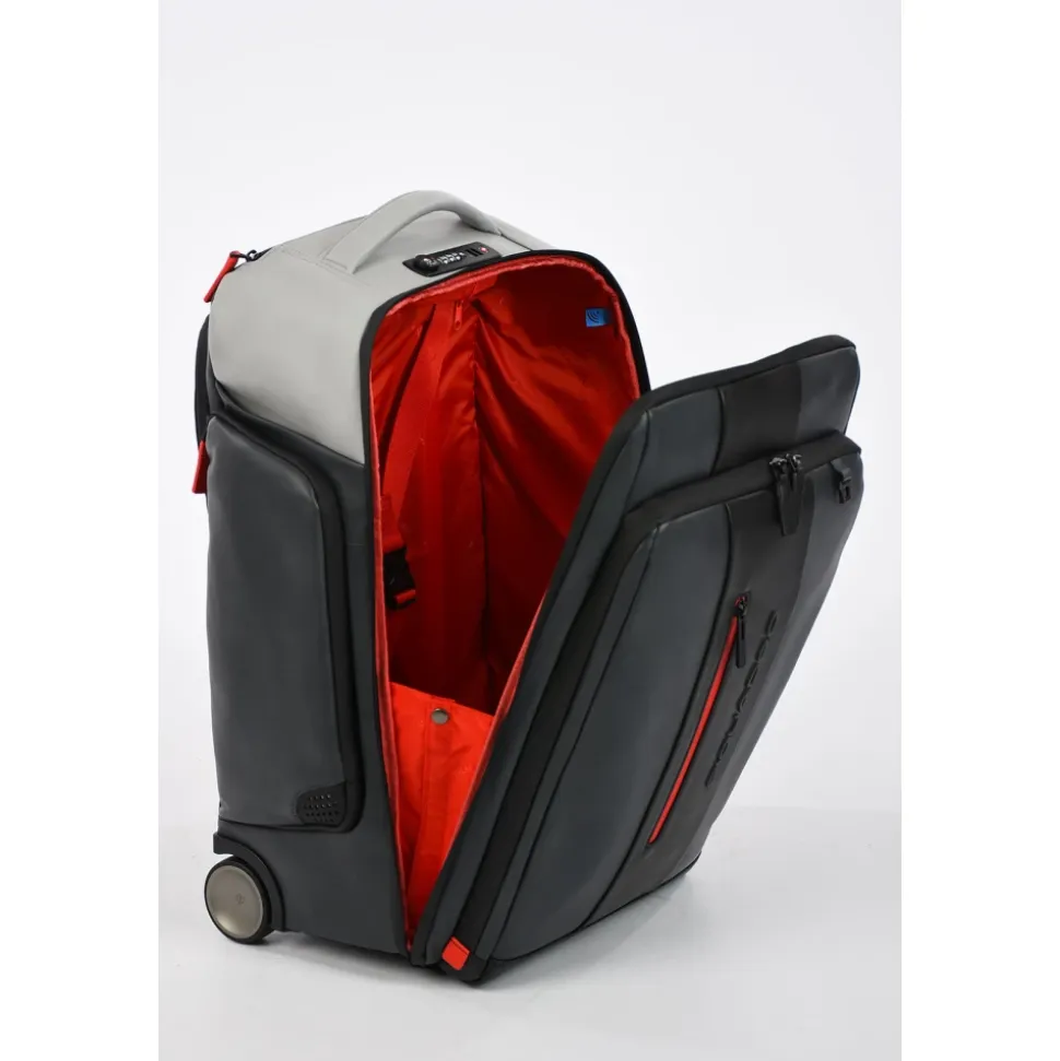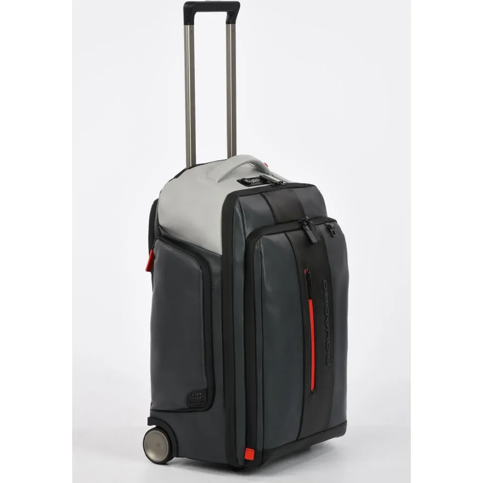 Opdag Piquadro Cabin Bag til mænd, lavet i fin læder. Vejer kun 2,9 kg, med dimensioner på 35,00 x 53,50 x 25,00 cm, denne halvstive taske har en USB- og micro-USB-plade, vertikale konstruktionsdetaljer, trolley-system med to stænger, fast skulderrem og et polstret rum til en 15,6″ notebook.