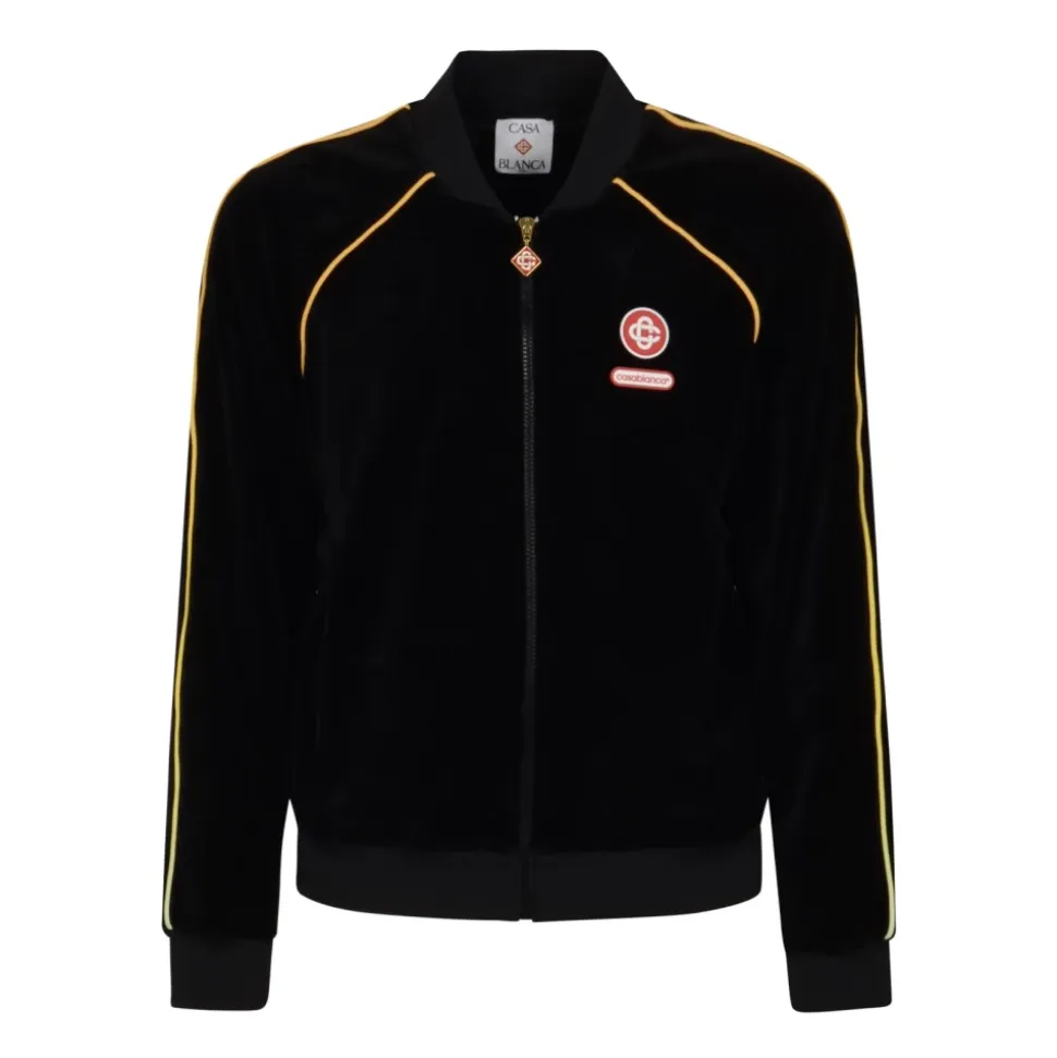 Casablancas Gradient Piping Velour Track Jacket kombinerer blød velour med karakteristisk gradient piping for et afslappet, eksklusivt sportsbeklædningsstykke. Vigtige egenskaber: Sort | Bomuldsblanding velour | Mellemvægt | Let stretch | Blød tekstur | Lynlåslukning | Welt lommer | Fuldt foret | Ribkant i kraven, manchetter og forneden | Diamant logo lynlås vedhæng | Gradient piping tværs over skuldre, ærmer og bryst | Sammenflettede CC logo og logo patch | Japansk-skrift branding under bærestykket | Rib baseball krave | Dimensioner & pasform: Afslappet pasform | Sammensætning & pleje: Hovedmateriale: 89% bomuld, 11% polyamid | Foring: 100% polyester | Specialiseret renseri.