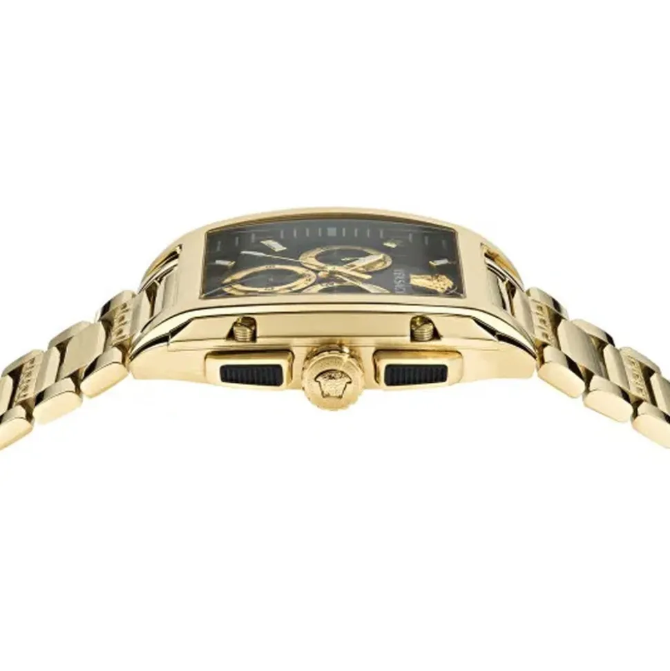 The Versace VE6H00523 is an elegant men’s watch that combines fashionable design with functionality. Its gold steel case with an unusual rectangular shape gives it a unique character. The watch is equipped with a quartz movement and sapphire crystal, which guarantees reliability and durability. In addition, it has chronograph, date and 12-hour stopwatch functions, making it the perfect companion for men who appreciate luxury and sporty style. The butterfly clasp with security lock ensures comfort, and the gold steel bracelet adds elegance.