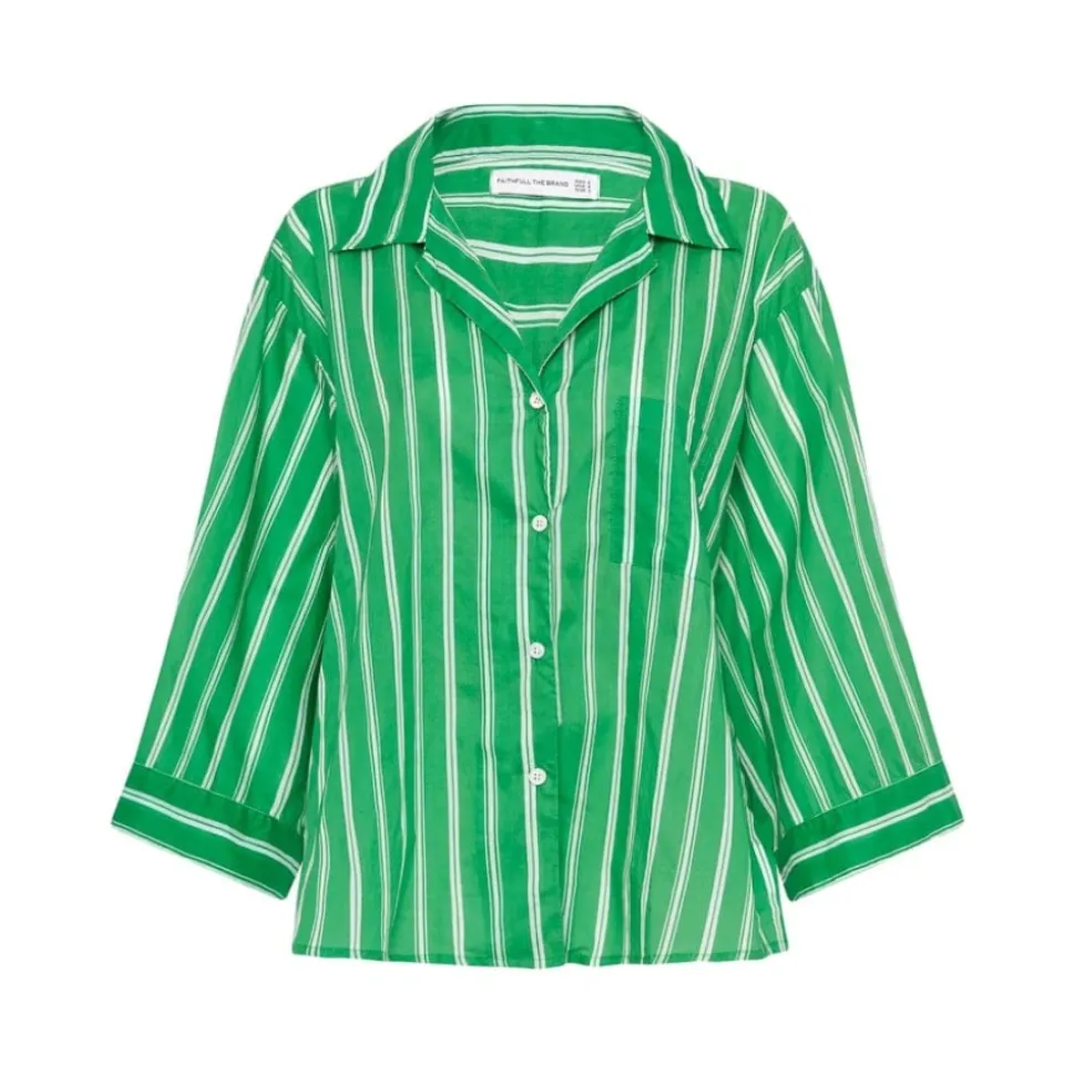 Paradise Shirt fra Faithfull the Brand. Et must-have til lange dage ved havet: Paradise Shirt er perfekt at bruge over din bikini eller badedragt – gerne kombineret med denim shorts. Skjorten har en afslappet pasform, dejlig grøn grundfarve og håndtrykte hvide striber. Materiale: 100% bomuld voile – OEKO-TEX100® certificeret.