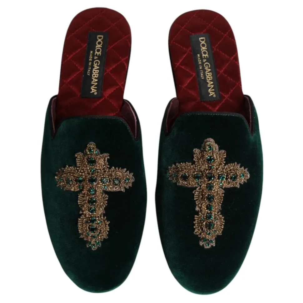 Forkæl dig selv med disse luksuriøse Dolce & Gabbana grønne fløjlsslides. Fremstillet i Italien med materialer af høj kvalitet, disse slip-on sandaler har en glat rød satin indersål og lædersål. En perfekt kombination af eksklusivitet og håndværk.