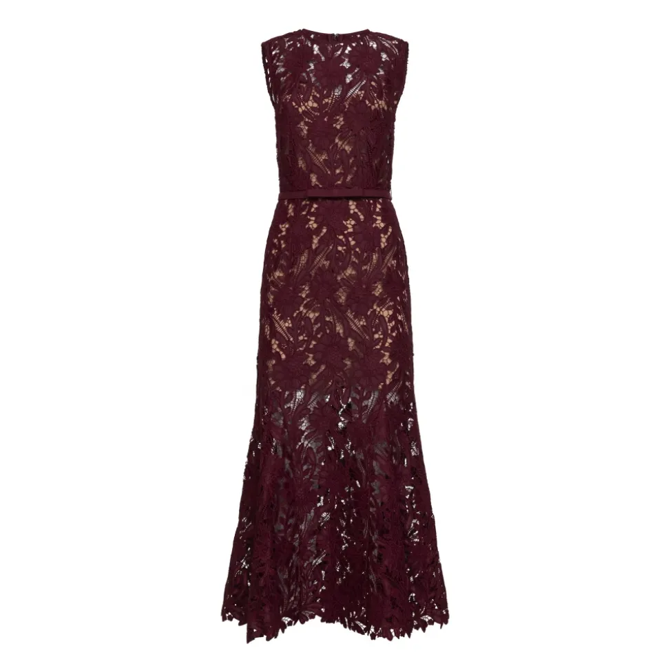 Self Portrait Guipure Lace Belted Midi Dress kombinerer guipure blonde tekstur med en figursyet talje og et aftageligt, tyndt bælte med sløjfedetalje. Designet til elegante dags- eller aftenbegivenheder, og tilbyder en struktureret silhuet og aftagelig cami-foring for justerbar dækning. Vigtigste egenskaber: Burgundy | Polyester | Usynlig lynlåslukning bagpå | Justerbart og aftageligt tone-i-tone tyndt bælte med sløjfedetalje | Aftagelig delvis foring med hudfarvet kort cami-kjole | Rund hals | Brede skulderstropper | Ærmeløs | Sløjfedetalje foran | Figursyet talje | Udskåret bund | Ankellængde | Dimensioner & pasform: Ankellængde | Figursyet pasform | Sammensætning & pleje: 96% Polyester, 4% Elastan