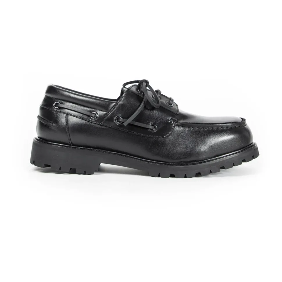 Studio Nicholson Guston Boat Shoe opdaterer en klassisk moc-toe silhuet med snørelukning og en profileret Vibram gummisål for forbedret greb. Designet kombinerer en sort læderoverdel med piskesting og topstikningsdetaljer for en raffineret hverdags boat shoe. Vigtigste egenskaber: Sort | Læder | Profileret Vibram gummisål | Holdbar læderoverdel | Snørelukning | Polstret krave | Poleret læderforing | Moc-toe silhuet | Piskestingskant | Paneldesign | Topstikningsaccenter | Sammensætning & pleje: Læderoverdel | Læderforing | Gummisål