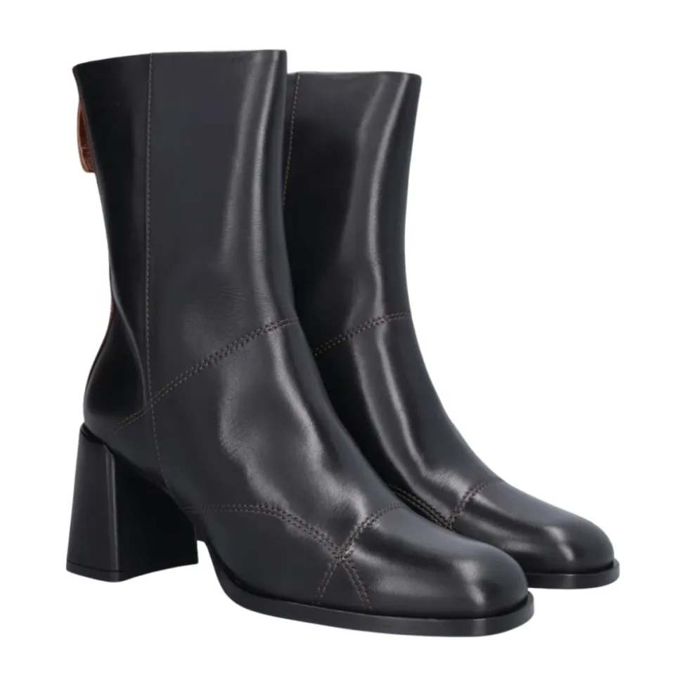 Håndlavede hælstøvler fra Billi Bi, udført i glat sort læder med en firkantet tå. Dekoreret med korssting foran og med et tyndt stykke brunt læder på hver side af lynlåsen bagpå. Støvlerne har en høj blokhæl.