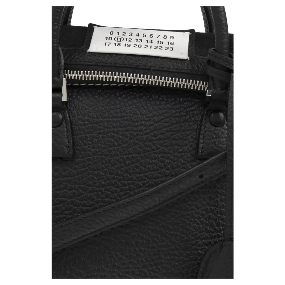 Maison Margiela Håndtaske 5AC Mini er et sofistikeret tilbehør, der kombinerer klassisk elegance med moderne design, fremstillet af læder af høj kvalitet for en luksuriøs fornemmelse. Produkt detaljer: Sort | Kalvelæder | Justerbar skulderrem | Flere indvendige lommer | Klassisk form | Sølvfarvede metalelementer | Karakteristisk nummerpatch | Dimensioner og pasform: Højde: 26 cm | Bredde på bredeste punkt: 26 cm | Bundbredde: 13 cm | Sammensætning og pleje: 100% Kalvelæder | 79% Bomuld (Kontrast) | Aftørres med en blød klud