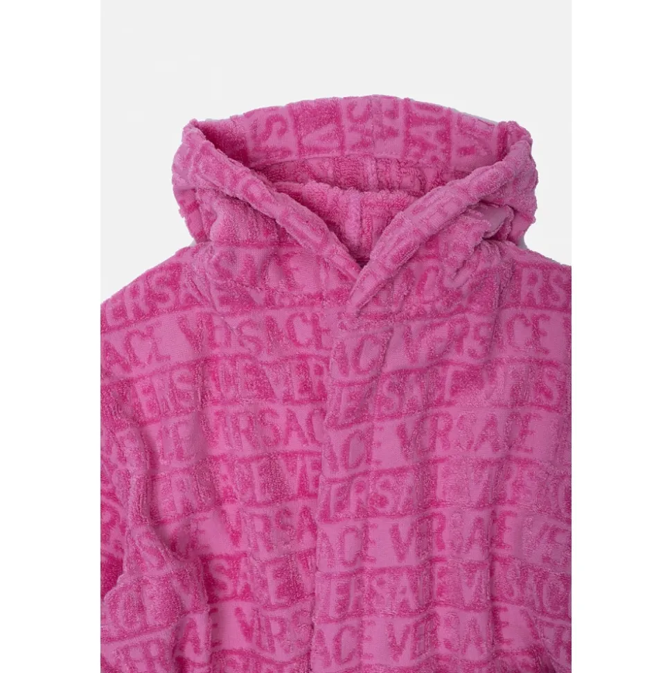 Lyserød badekåbe med hætte fra Versace Kids. Beriget med et taktilt monogrammotiv har denne stil hvide og gule Barocco-indsatser, et talje-cinch-bælte, to frontlommer og lange ærmer.