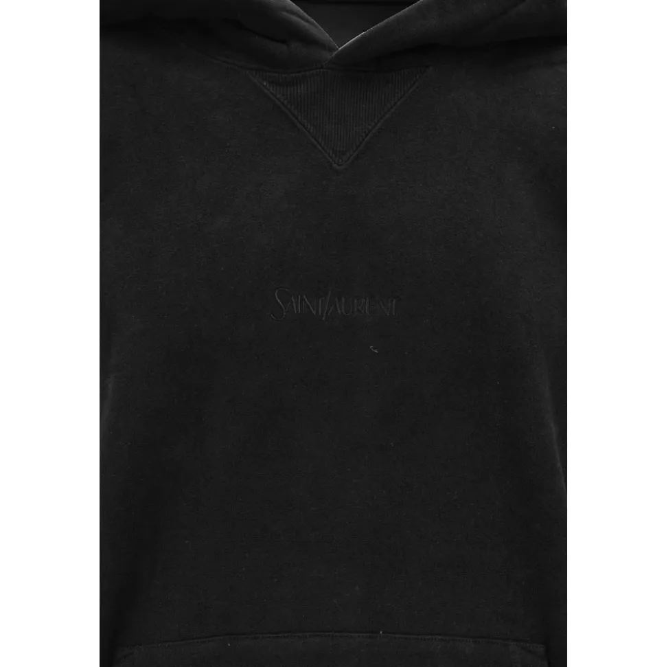 Opgrader din afslappede stil med Saint Laurents hættetrøje, der har et hævet brand-logo og er fremstillet af materialer af høj kvalitet. Denne alsidige beklædningsgenstand er perfekt til hverdagsbrug. Produkt detaljer: Sort | Bomuld | Kængurulomme | Hævet brand-bogstavering | Ribstrikkede ærmekanter | Sammensætning og pleje: 100% bomuld | 52% acetat | 48% viskose | 100% polyester