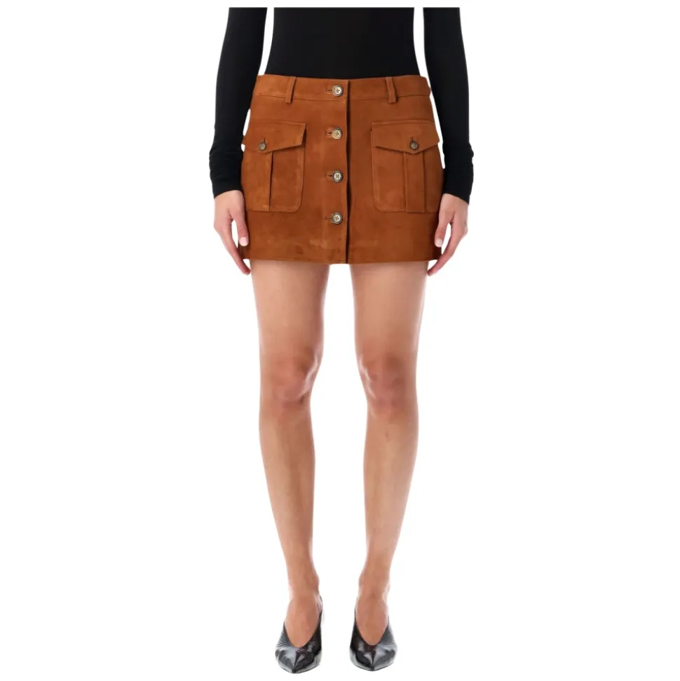 Forkæl dig selv med denne hasselnødde mini nederdel fra The Garment, lavet af blød gedeskindssuede. Med en dekorativ knap række, to store lommer og bæltestropper til alsidig styling. Modellen er 1,75 m og bruger størrelse 8.