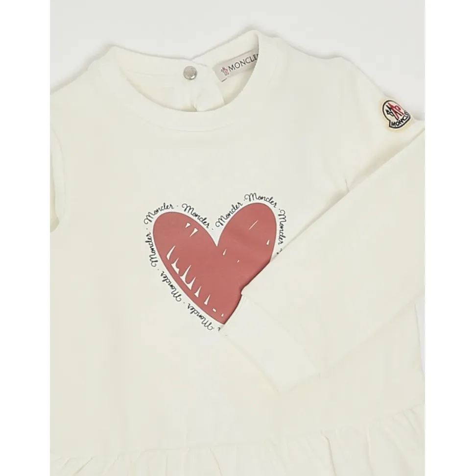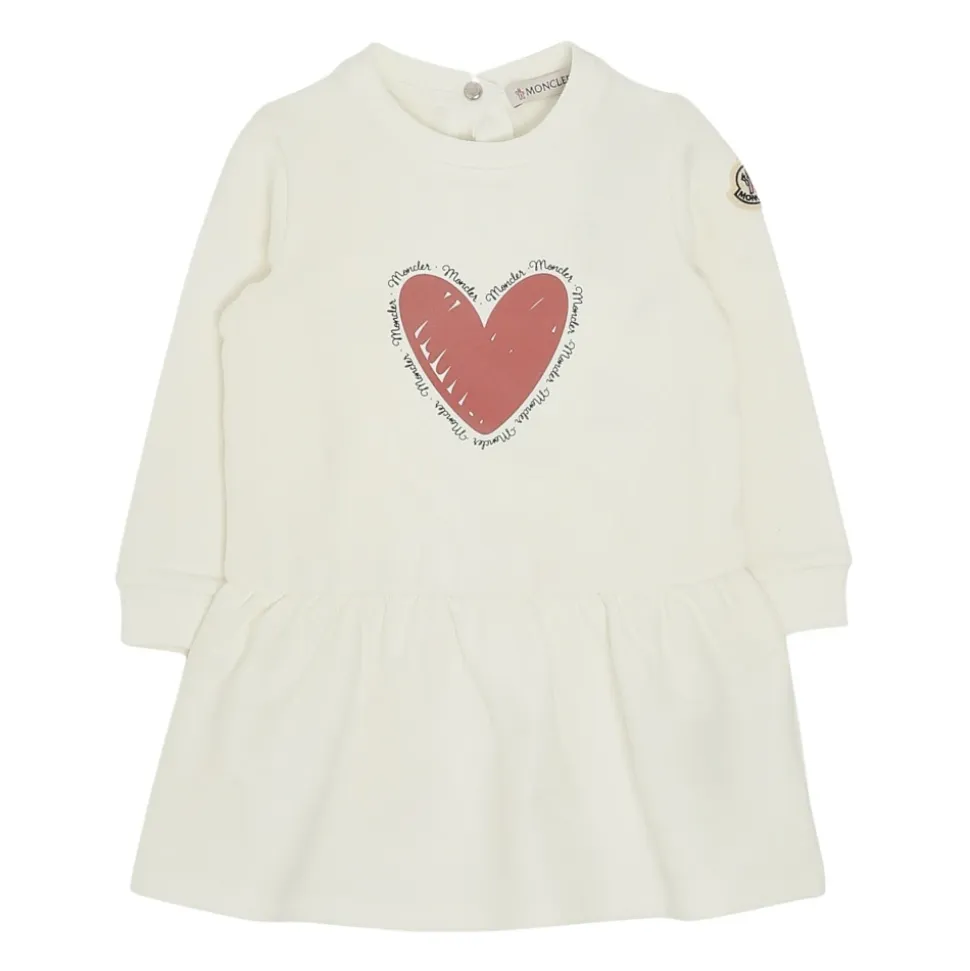 Moncler Heart Motif Cotton Dress kombinerer blød bomuldsfleece med et legende, trykt hjerte, der giver en behagelig komfort hele dagen. Den er designet til hverdagsbrug og har en udvidet nederdel og lange ærmer, der giver let bevægelse. Vigtige egenskaber: Hvid | Bianco | Bomuldsfleece | Strækstof | Trykknaplukning bagpå | Ribkanter | Rund hals | Lange ærmer | Udvidet nederdel | Trykt hjertemotiv | Sammensætning og pleje: Basismateriale: 95% bomuld, 5% elastan | Rib: 95% bomuld, 5% elastan | Maskinvask ved maks. 30°C (mild proces). Må ikke bleges. Må ikke tørretumbles. Stryges ved maks. 110°C uden damp. Må ikke kemisk renses. Professionel vådrens (mild proces). Tørres fladt i skyggen.